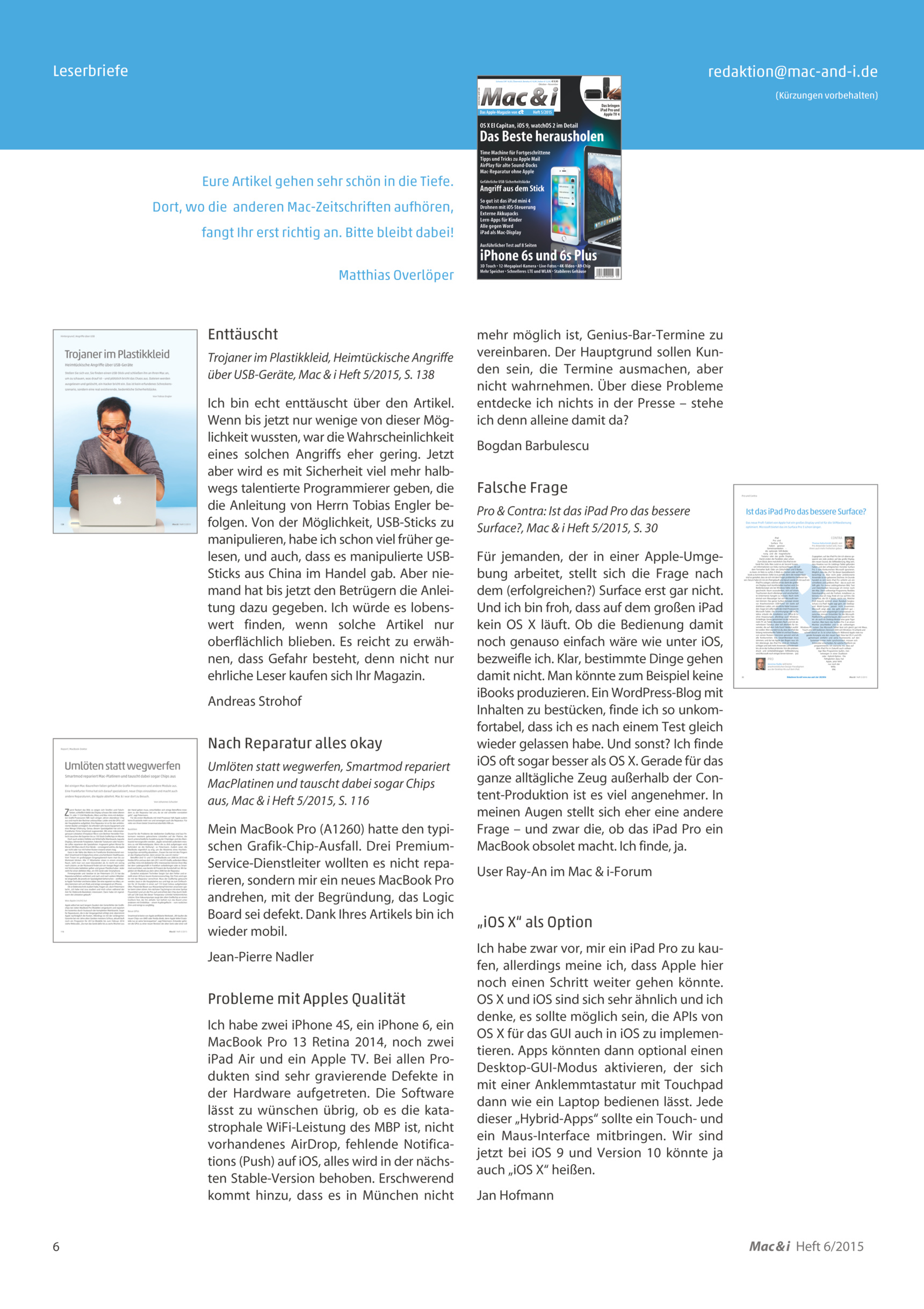 Leserbrief von Andreas Strohof zu Trojaner im Plastikkleid (Heft 5/2015) in Mac & i Heft 6/2015, S. 6