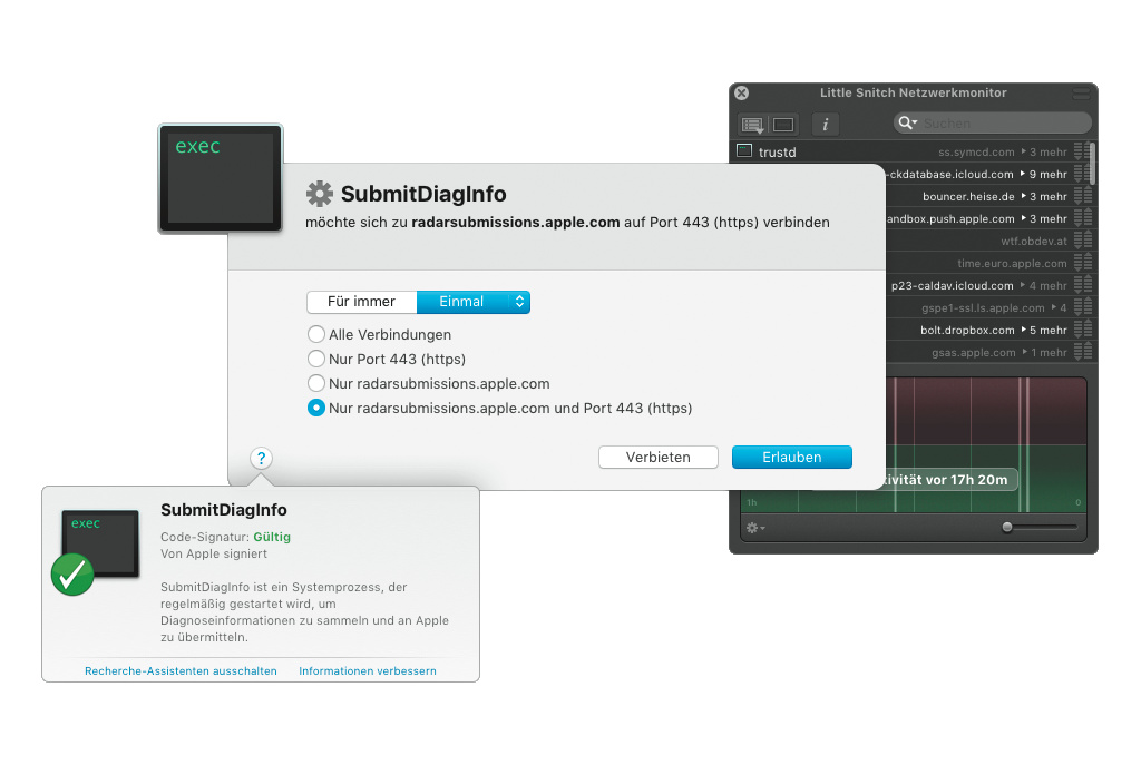Die Software protokolliert, welche Programme und Dienste mit Servern kommunizieren. Auf Wunsch blockiert Litte Snitch Netzwerkverbindungen oder erlaubt sie nur temporär.