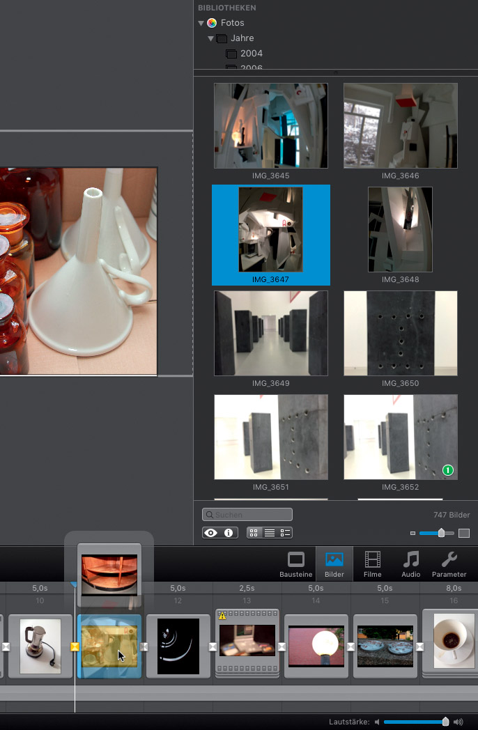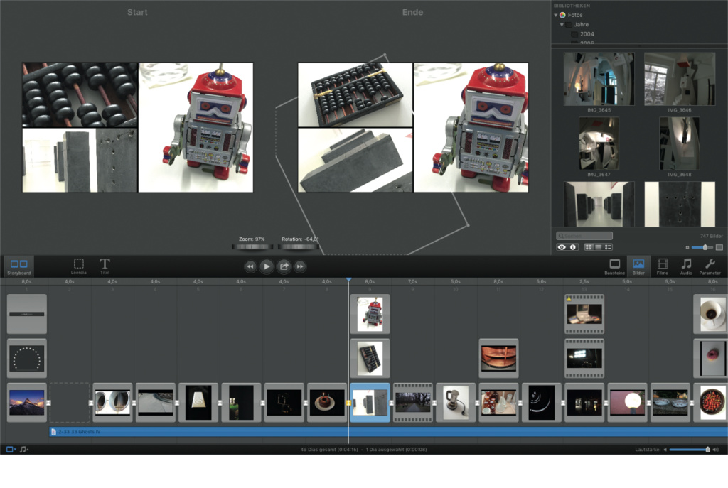 Bei Apples Fotos-App ist schnell Schluss mit den Gestaltungsmöglichkeiten bei Diashows: Lediglich eine Handvoll Themen stehen zur Auswahl, denen der Anwender weitgehend ausgeliefert ist. Das Resultat darf man maximal in HD-Filmen ausgeben, auch wenn die Originalbilder viel mehr drauf haben. FotoMagico hingegen gibt Ihnen volle Kontrolle über Bildausschnitte, Texteinblendungen und Effekte in leicht verständlicher Bedienoberfläche.