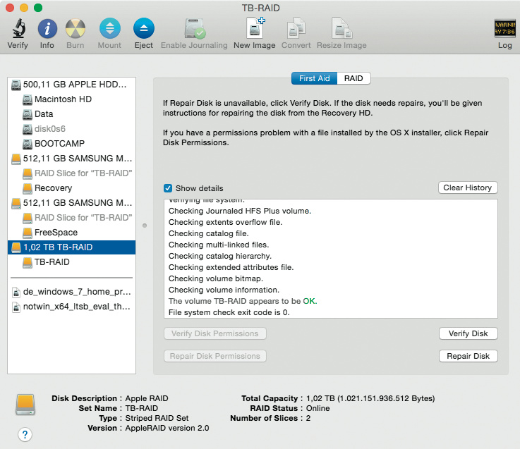Mit einem kleinen Trick kommen Sie auf Macs, die mit einer älteren Version von OS X ausgeliefert wurden, zumindest aktuell noch an eine RAID-fähige Version des Festplattendienstprogramms: Booten Sie Ihren Mac neu und halten Sie dabei Alt+Cmd+R gedrückt, um die Internet Recovery zu starten. Deren Festplattendienstprogramm enthält die alte Bedienoberfläche mitsamt den verschwundenen Optionen inklusive der Erste-Hilfe-Funktion für RAID-Volumes. Übrigens: Tools wie DiskWarrior 5 oder TechTool Pro 8 (siehe Mac & i Heft 2/2015, S. 86) prüfen und reparieren das Dateisystem eines solchen Volumen ebenfalls ohne Murren.