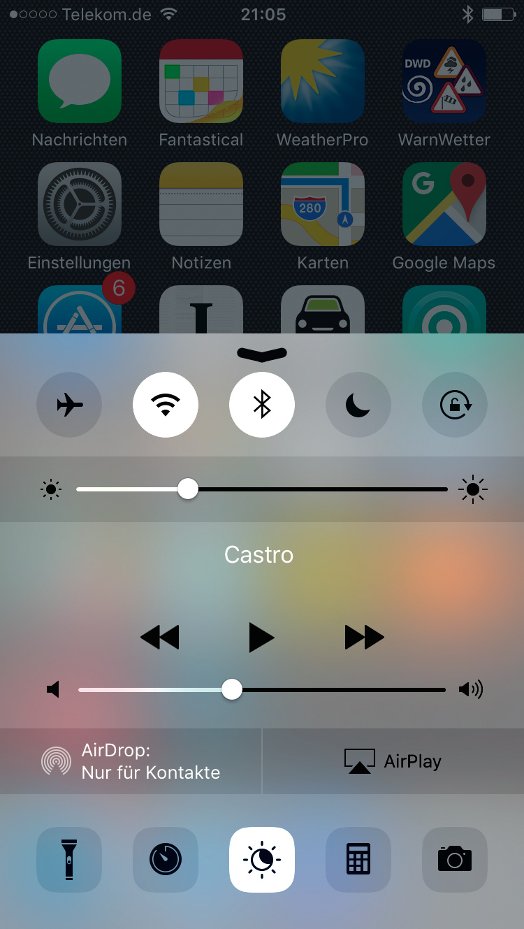 Der Nachtmodus ist standardmäßig ausgeschaltet. Um ihn zu aktivieren, öffnen Sie in den Einstellungen unter „Anzeige & Helligkeit“ den Bereich „Night Shift“. Dort können Sie die Farbtemperatur mit einem Schieberegler zwischen „kälter“ und „wärmer“ feinjustieren. Wählen Sie die Einstellung, die Ihnen zusagt – uns geriet die wärmere Seite schnell zu gelblich-bräunlich – und schieben Sie dann den Schalter für „Manuell bis morgen aktivieren“ nach rechts. Alternativ können Sie Night Shift jederzeit über das Kontrollzentrum aktivieren oder deaktivieren, das Sie vom unteren Bildschirmrand hereinwischen. Dort hat Apple einen neuen Button zwischen Timer- und Taschenrechner-Verknüpfung hinzugefügt.
