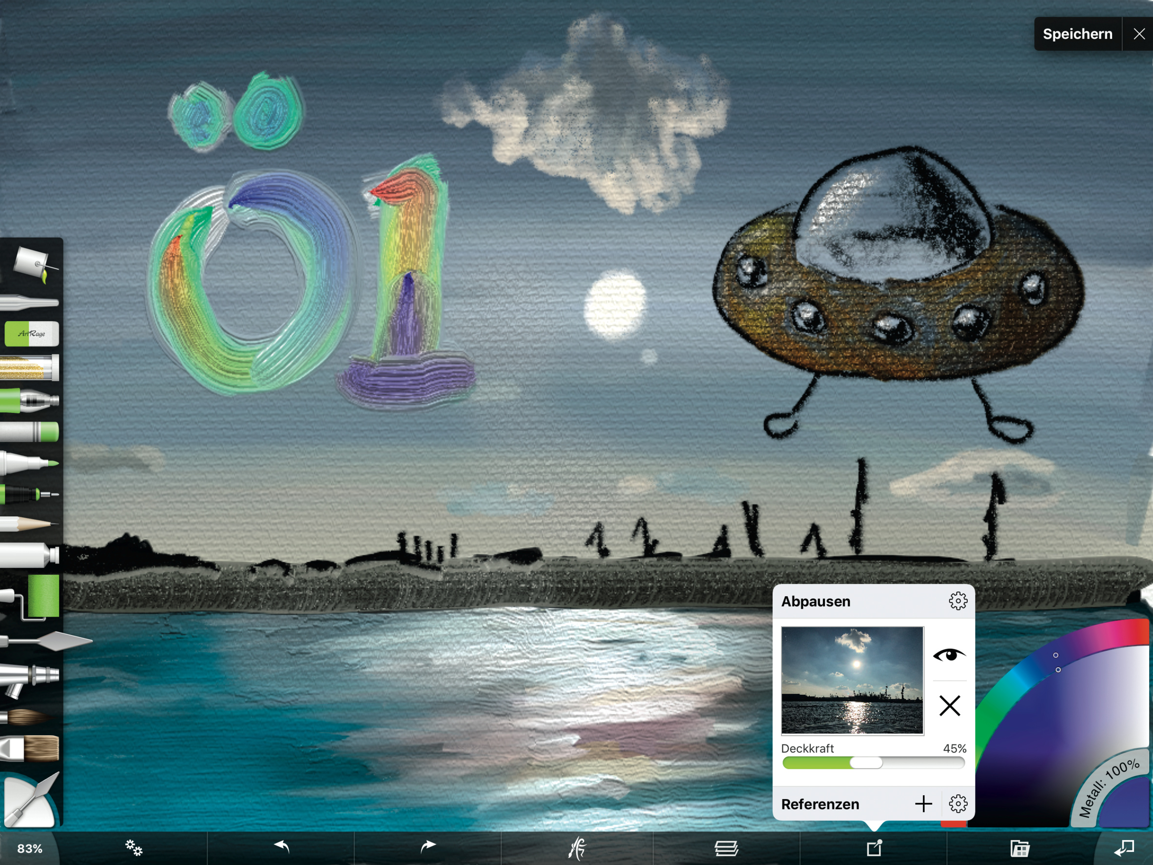 Mit anderen Werkzeugen, insbesondere dem Spachtel, lässt sich die pastöse Farbe verteilen und der Materialauftrag so weit reduzieren bis der Malgrund wieder zum Vorschein kommt. Zu jedem Tool gibt es vorgefertigte Einstellungen, die man um eigene ergänzen kann. So bestimmt der Parameter „Farbmenge“, wie lange ein Pinsel seine Farbe behält und „Selbstreinigen“, ob erneutes Ansetzen wieder die anfangs ausgewählte Farbe aufträgt. Für das echte Malgefühl fehlt allerdings eine Mischpalette, über die man Farben intuitiv zusammenrühren kann. Zudem ist nicht ersichtlich, wie viel Farbe ein Pinsel aufgenommen hat.