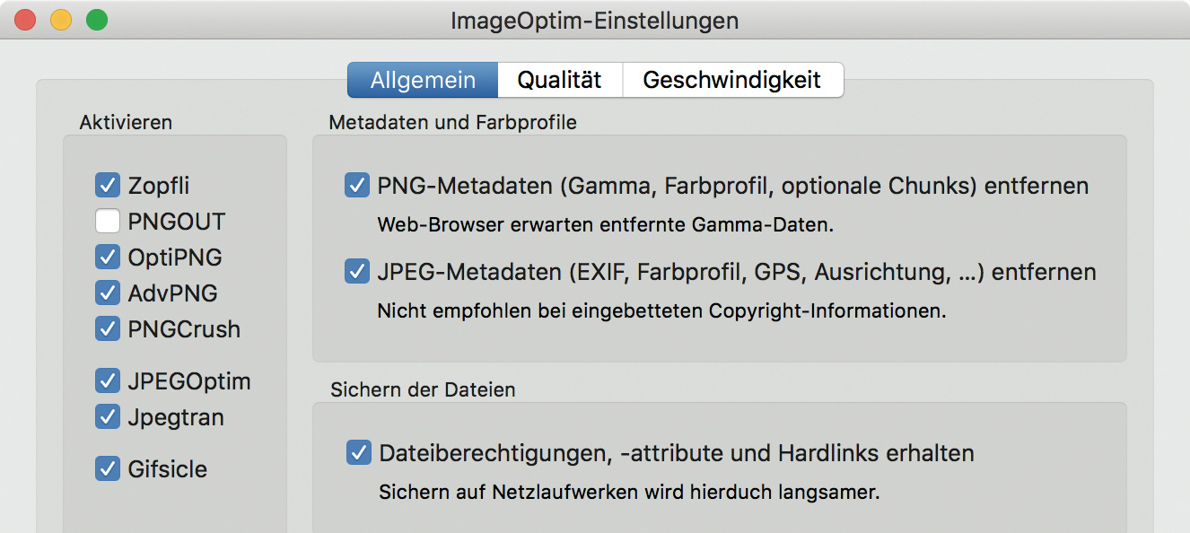 Hier hilft das einfach zu bedienende Spezial-Tool ImageOptim für OS X. Man zieht eine oder mehrere Bilddateien in den Drag-&-Drop-Bereich der App und die Optimierung beginnt. Die Originaldateien werden dabei automatisch und ungefragt durch verkleinerte Versionen ersetzt – selbst bei Netzwerk-Volumes findet man die Ursprungsfiles aber zur Not noch im lokalen Papierkorb.