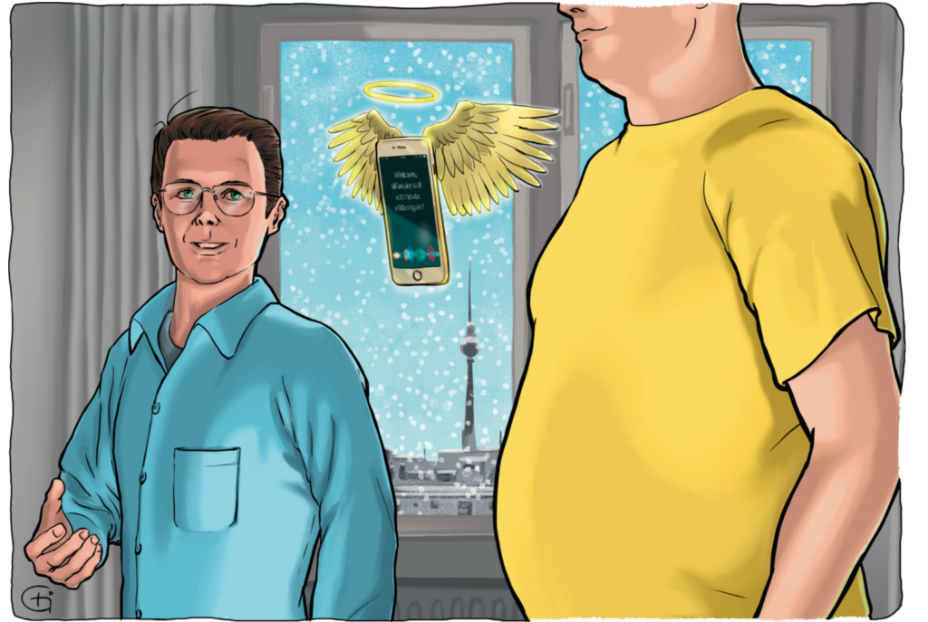 „Vielleicht werden nach Weihnachten auch die iPhones dicker“, sagte ich. „Wegen der vielen Cookies.“