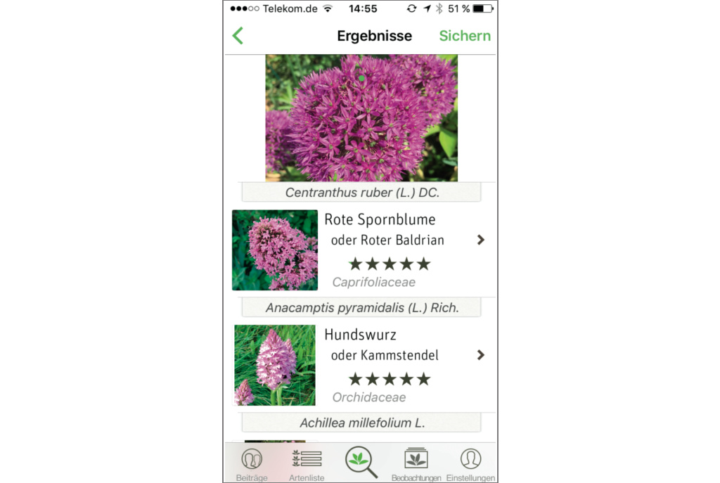 Bei Tests in Tauberfranken und Hannover erwies sich die App als treffsicher, von 50 Pflanzen konnten wir damit nur drei nicht bestimmen. Fotografierten wir die Pflanzenteile so, dass sie deutlich zu erkennen waren und keine anderen Pflanzen im Bild erschienen, fanden wir die gesuchte Pflanze meist unter den ersten Vorschlägen. Passt gar kein Vorschlag, kann man selbst recherchieren und das Ergebnis an die Forscher der vier französischen Institute schicken, die PlantNet entwicklen und betreiben. Die überprüfen den Beitrag und übernehmen ihn gegebenenfalls in den Datenbestand.