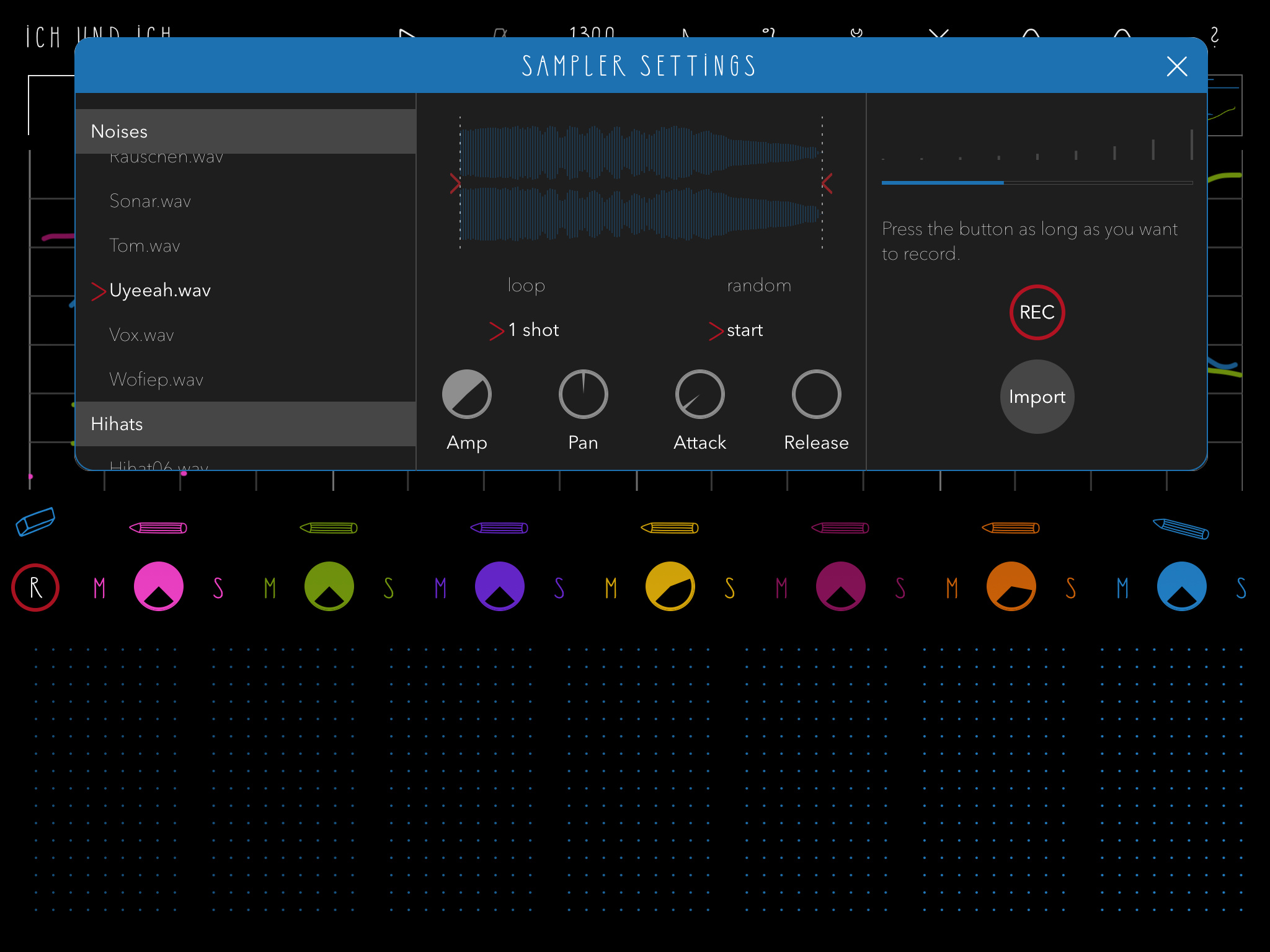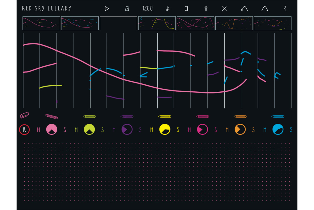 Kern der App ist ein siebenspuriger Sequenzer. Die „Noten“ malen Sie ganz einfach mit dem Finger im oberen Bereich von fluXpad ein. Im Unterschied zu anderen Sequenzern besitzen die Spuren keine Namen, sondern Farben, sodass nach kurzer Zeit eine kunterbunte Zeichnung entsteht.