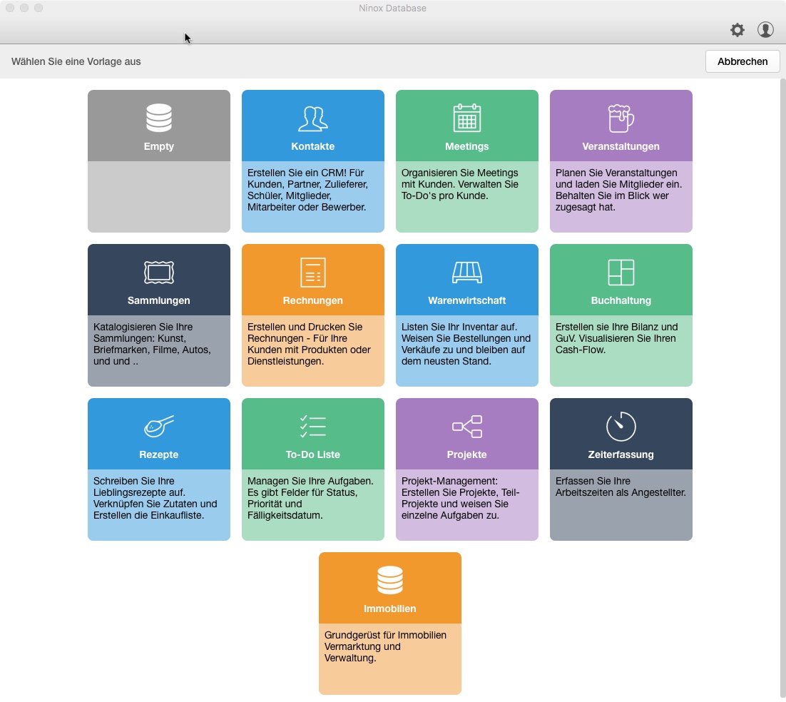 Ninox bringt bereits fertige Vorlagen mit, die überwiegend auf den professionellen Einsatz etwa Warenwirtschaft, Faktura oder Buchhaltung zielen. Diese Lösungen sind jedoch allesamt etwas simpel gestrickt, sie lassen sich aber individuell weiter ausbauen. So ist der Kontenrahmen bei der Buchhaltung knapp definiert. Dank CSV-Import lässt sich ein DATEV-Kontenrahmen importieren.