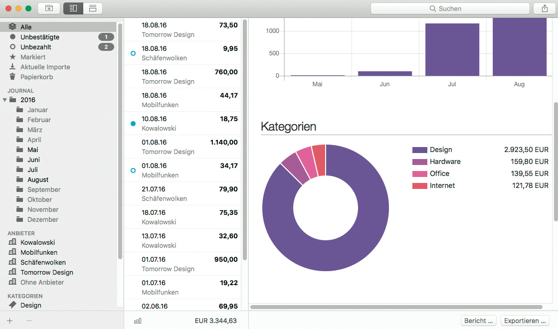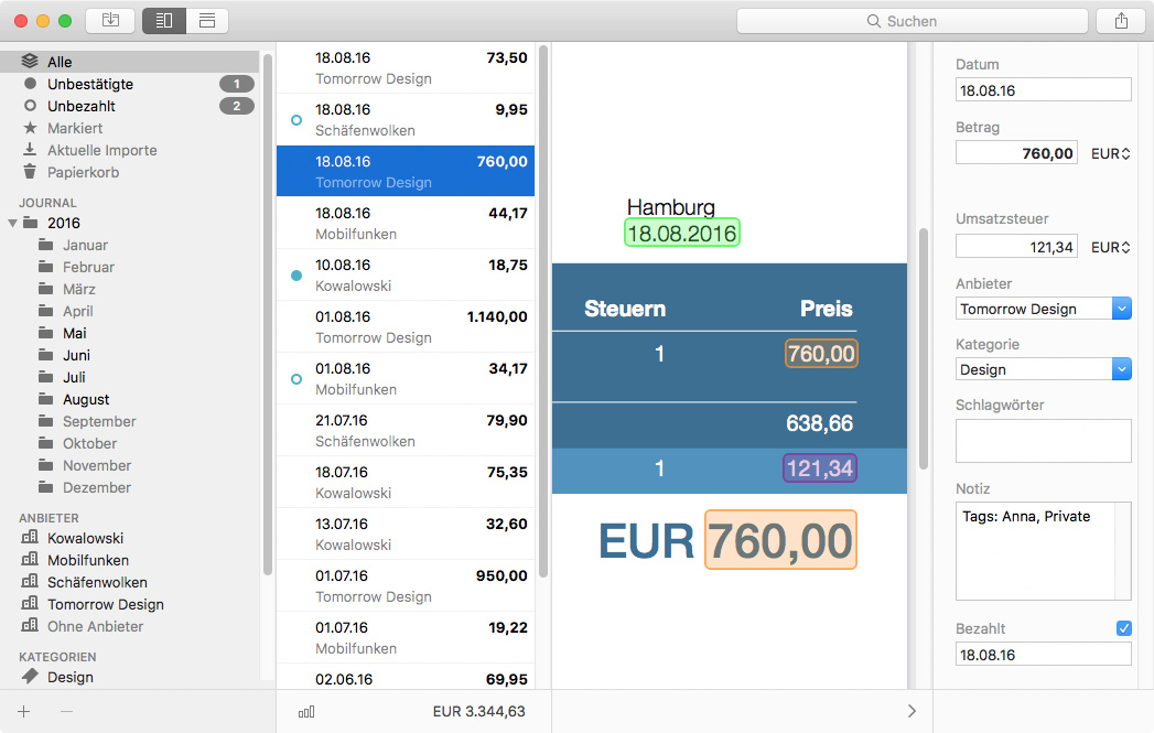Neue Belege analysiert Receipts und versucht dabei Belegdatum, Bruttobetrag, Umsatzsteuer sowie Bankverbindung zu erkennen. Die Erkennungsquote ist bei Dokumenten besser als bei Bildern, die es einer integrierten Texterkennung unterzieht; eine hohe Auflösung oder ein Beschneiden von Beleg-Fotos ist für die Erkennung hilfreich. Durch farbige Hervorhebungen signalisiert die Software erfolgreich erkannte Werte. Nicht Erkanntes oder zusätzliche Informationen kann man in einer Maske ergänzen. Nachträgliche Änderungen – wie das Einfügen des Namens eines Unternehmens – wendet Receipts auf alle ähnlichen Dokumente an. Das klappt zuverlässig und spart vor allem bei wiederkehrenden Belegen viel Zeit. Über das Kontextmenü bestätigt man Einträge nach der Erkennung als korrekt und kann diese zudem als bezahlt oder zur Bezahlung ausstehend markieren.