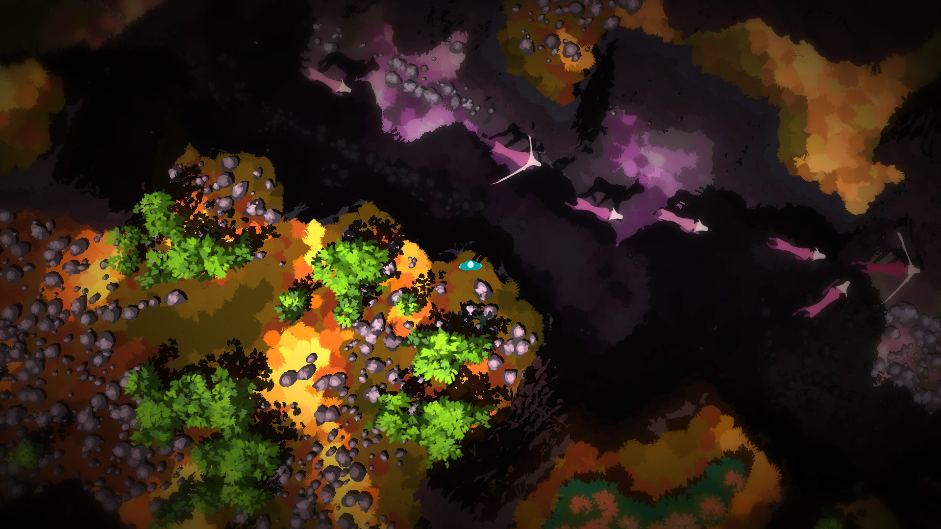 Während man so herumirrt, kommt doch eine helfende Texteinblendung zu Tage: Die Leertaste dient demnach zur Interaktion mit der Umwelt. So kann man zum Beispiel Tiere dazu bewegen, der Spielfigur zu folgen. Nachdem das also geklärt wäre, geht es weiter auf der Reise durch diese bunte und unbekannte Welt. Die von Hand gestaltete, knallbunte Umwelt wird prozedural variiert und ist laut Hersteller für jeden Spieler einzigartig.