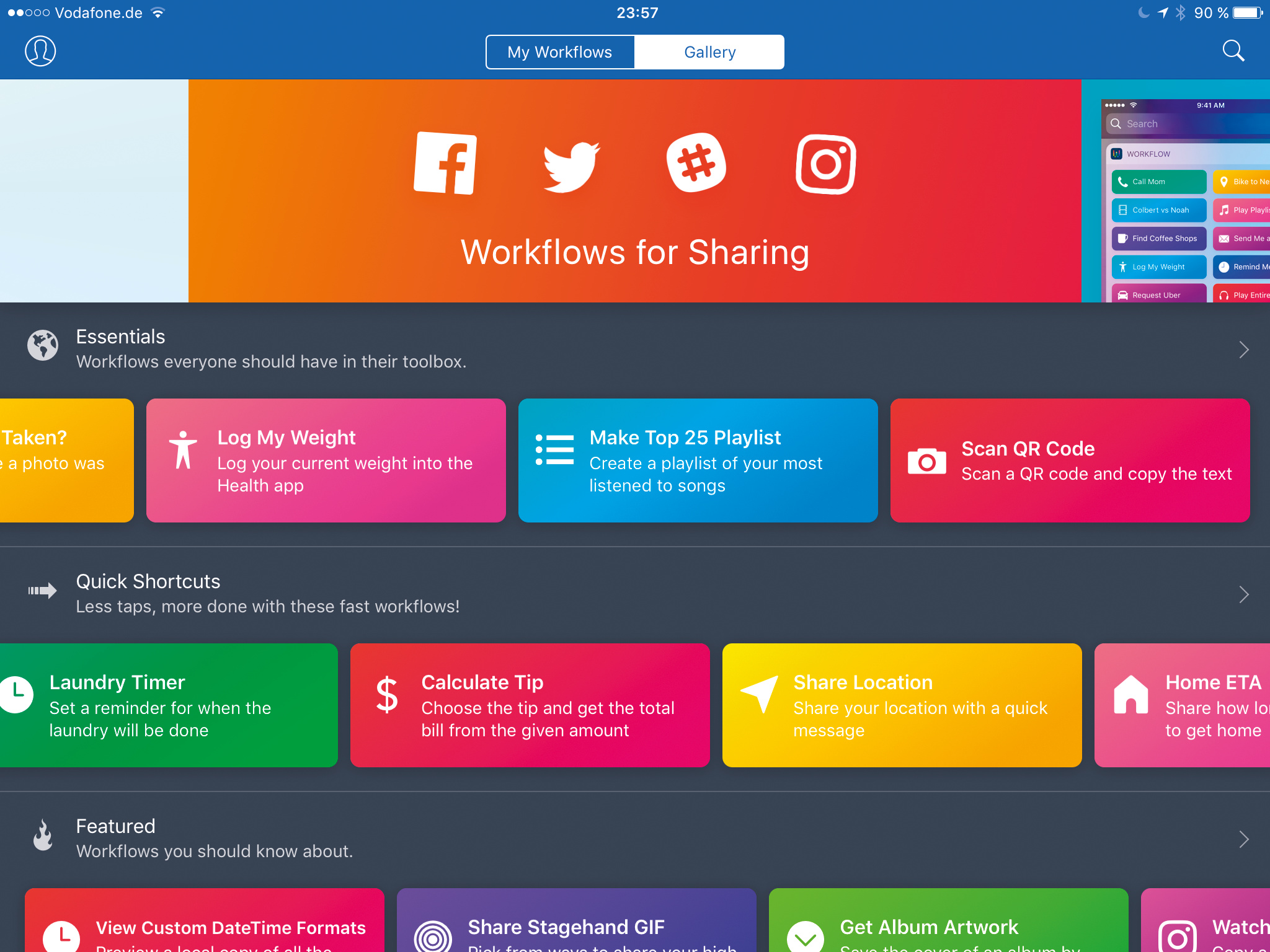 Es gibt Momente, da vermisst man am Touchscreen den ausgewachsenen Rechner mit Tastatur und Maus. Der Mac-Desktop bietet Platz für viele gleichzeitige Programmfenster, das erleichtert das Hin- und Herschieben von Dateien. Konfigurierbare Tastenkürzel und Wischgesten erledigen bestimmte Funktionen viel schneller als zwei Hände auf dem berührungsempfindlichen Display. Und für wiederkehrende Arbeitsabläufe baut sich der erfahrene Anwender im „Automator“ ein eigenes Mini-Programm. Das bietet Apple für iOS aber nicht an. Zum Glück gibt es die App Workflow. Deren Skripte binden wieder, was Apples Sandbox streng geteilt. Die Fähigkeiten von Workflow gehen sogar weit über die von Automator hinaus. Zwar ist die Oberfläche komplett in Englisch gehalten, doch ist sie halbwegs leicht verständlich.