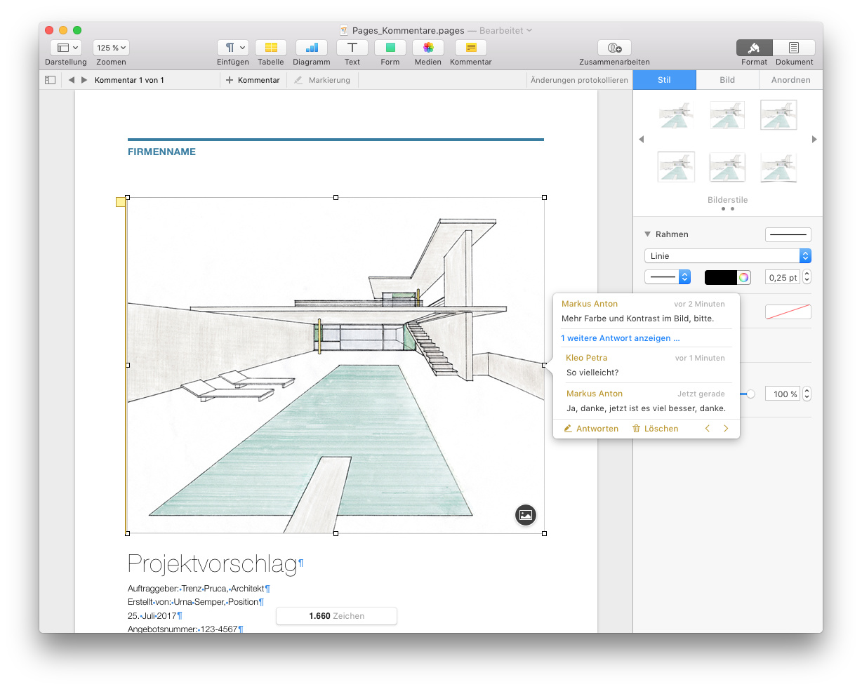 Text kann in Pages 6.2 wieder über mehrere Rahmen fließen, auch wenn diese sich etwa auf verschiedenen Seiten befinden – praktisch etwa für eine überlaufende Info-Spalte eines Newsletters. Verkettete Textrahmen erleichtern den Aufbau vor allem im Dokumentmodus „Seitenlayout“, denn einen zentralen Fließtext gibt es hier nicht. Stattdessen platziert man Text-, Bild- und Grafikrahmen nach Belieben.
