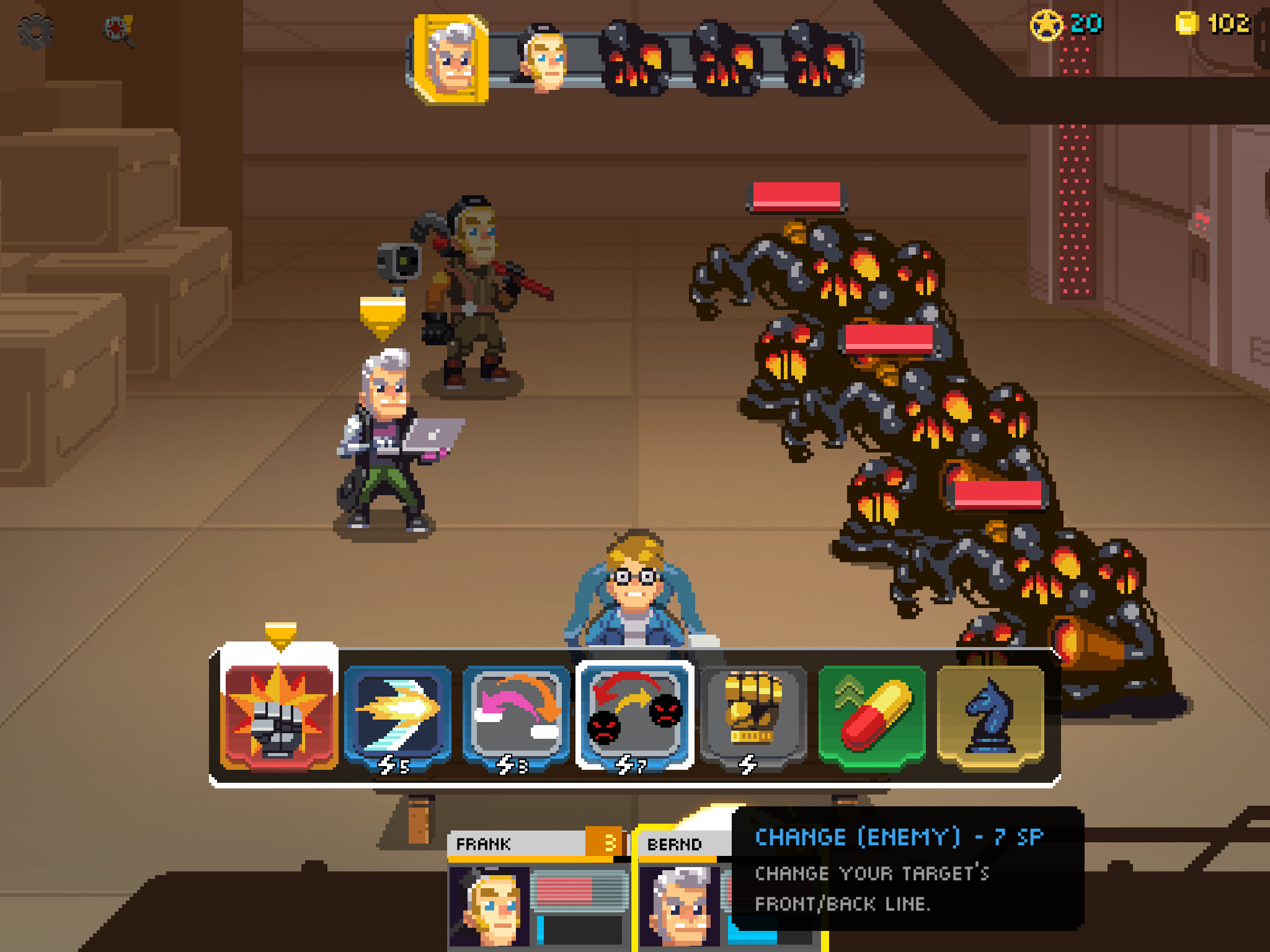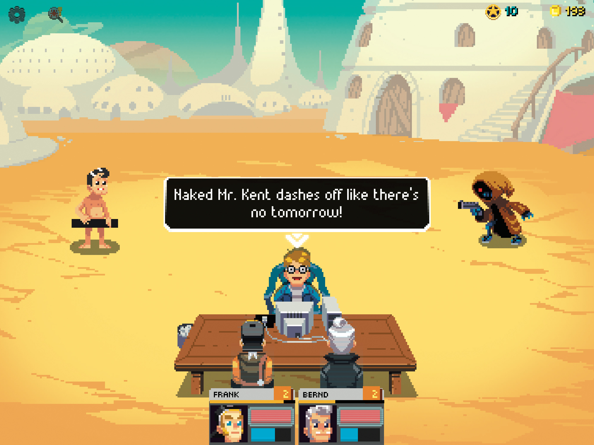 Zu Beginn erschafft man zwei Abenteurer, die am Tisch im Vordergrund Platz nehmen. Je nach Wahl der Charakteristika haben sie unterschiedliche Startwerte für Stärke, Konstitution, Intelligenz und mentale Fähigkeiten.