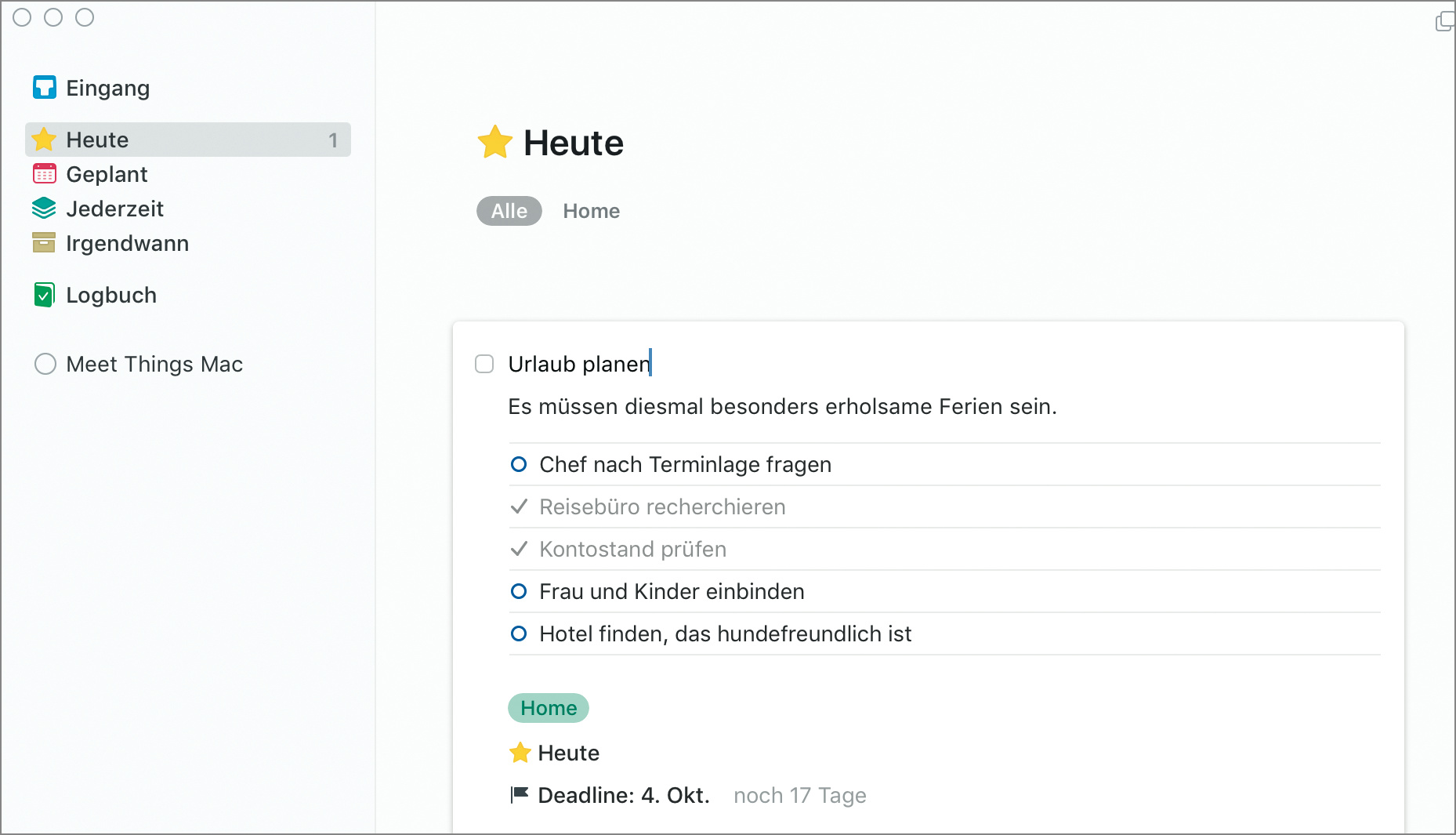 Einzelne Aufgaben wie auch ganze Projekte kann man mit einem Starttermin und/oder einer Deadline versehen. Für langfristige Vorhaben lässt sich mit „Irgendwann“ auch ein weniger spezifischer Termin festlegen. Abgeschlossene Tasks räumt Things auf Wunsch automatisch ins Logbuch, wo sie jederzeit abrufbar bleiben.