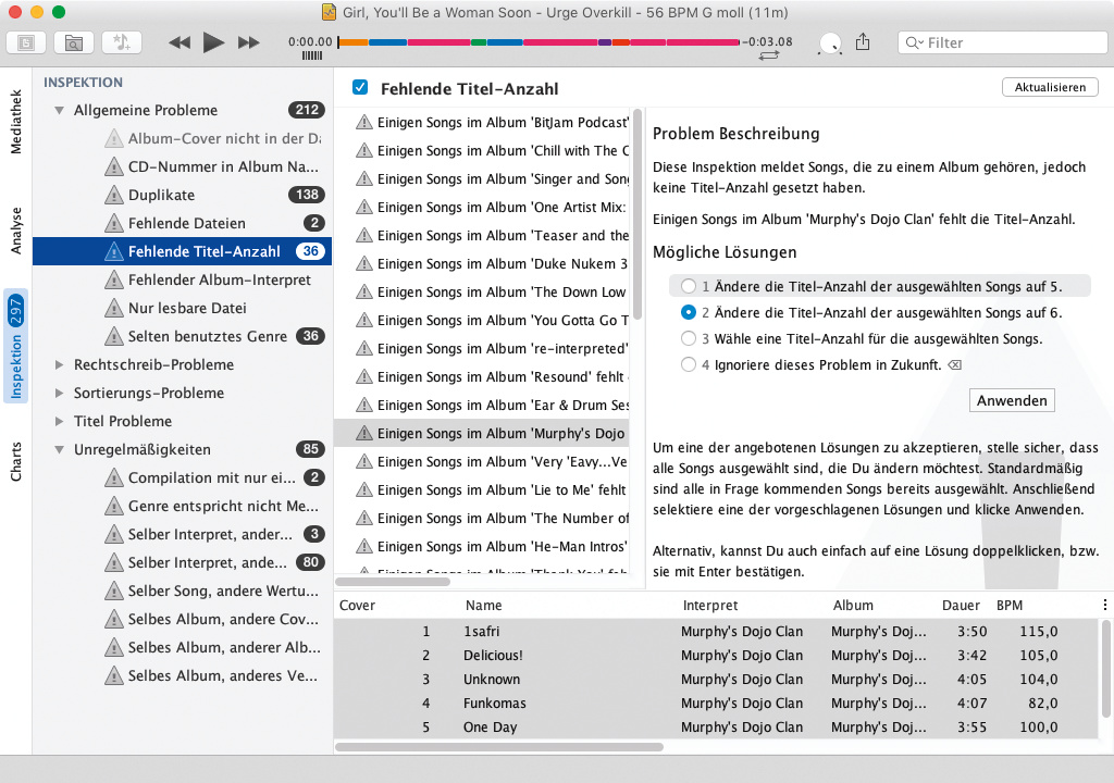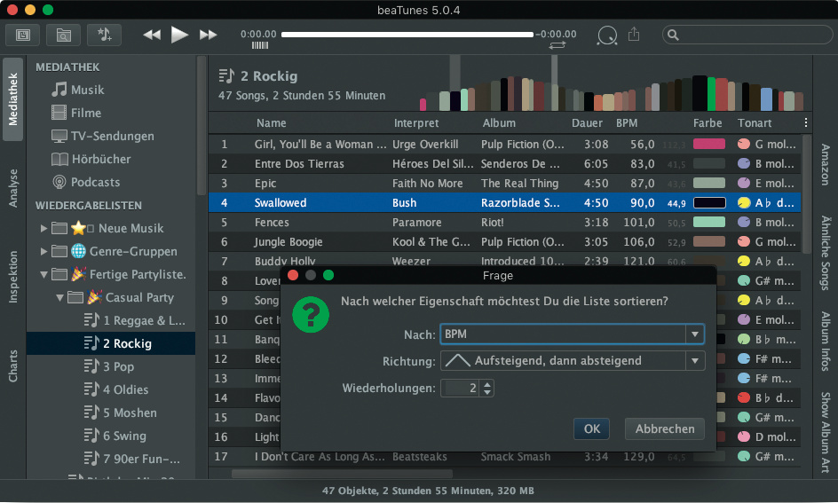 Das Programm greift wahlweise auf die iTunes-Mediathek oder einen selbst verwalteten Ordner mit Musik-Dateien zu. Die Bedienung orientiert sich an iTunes, hübsche Ansichten für Alben und Browser für Genre oder Interpret fehlen. Der neue Dark Mode zeigt beaTunes mit dunkler Bedienoberfläche.