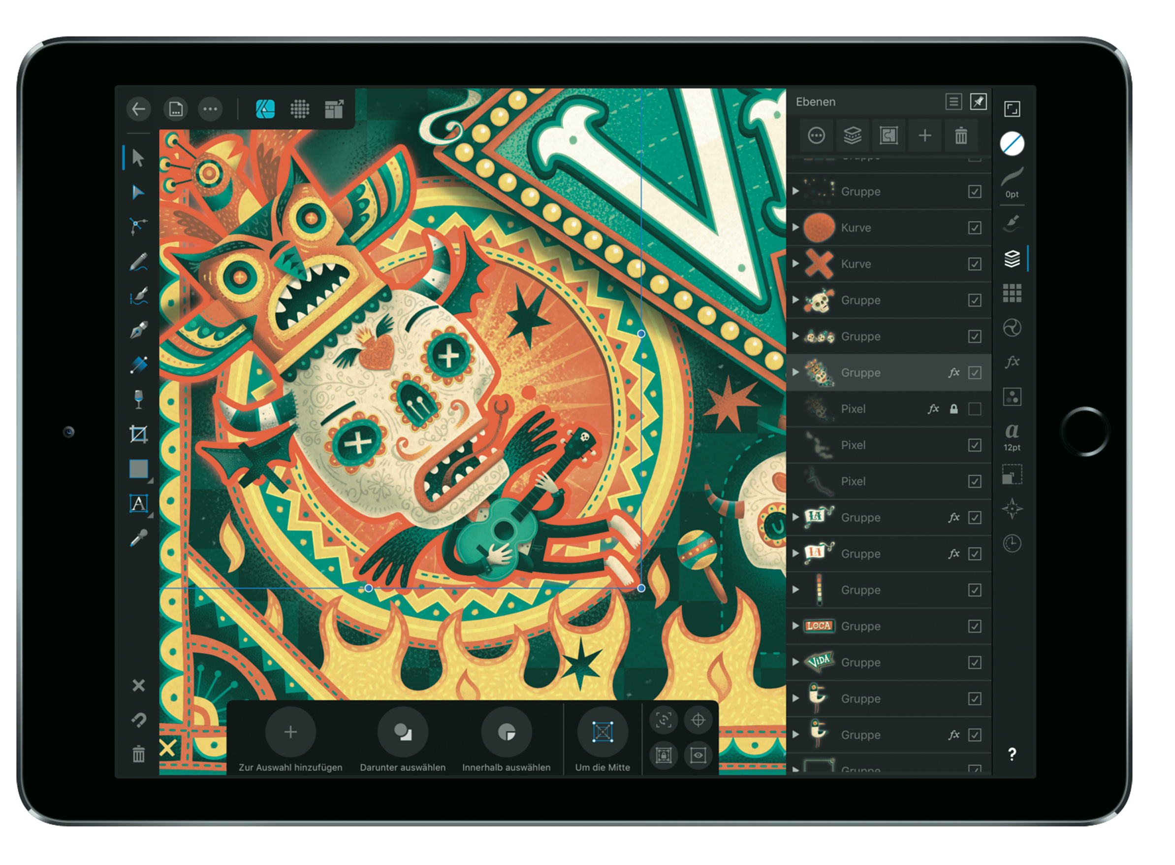 Wer Affinity Designer für macOS kennt, kann sich auf den etwa gleichen Funktionsumfang bei der iPad-Version freuen. Der Hersteller Serif aus dem britischen Nottingham hat dabei geschickt die Bedienphilosophie an die Besonderheiten auf dem Tablet angepasst. Wenn man beim Bewegen eines Objektes einen zweiten Finger auf den Screen legt, beschränkt man den Bewegungsradius (wie beim Drücken der Shift-Taste in macOS). Um mehrere Elemente zu selektieren, hält man das erste gedrückt und fügt mit kurzen Touches eines anderen Fingers weitere hinzu. Mehrere Ebenen selektiert man mit Wischgesten und eine Eingabe lässt sich durch einen kurzen Tipp mit zwei Fingern auf die Seite .