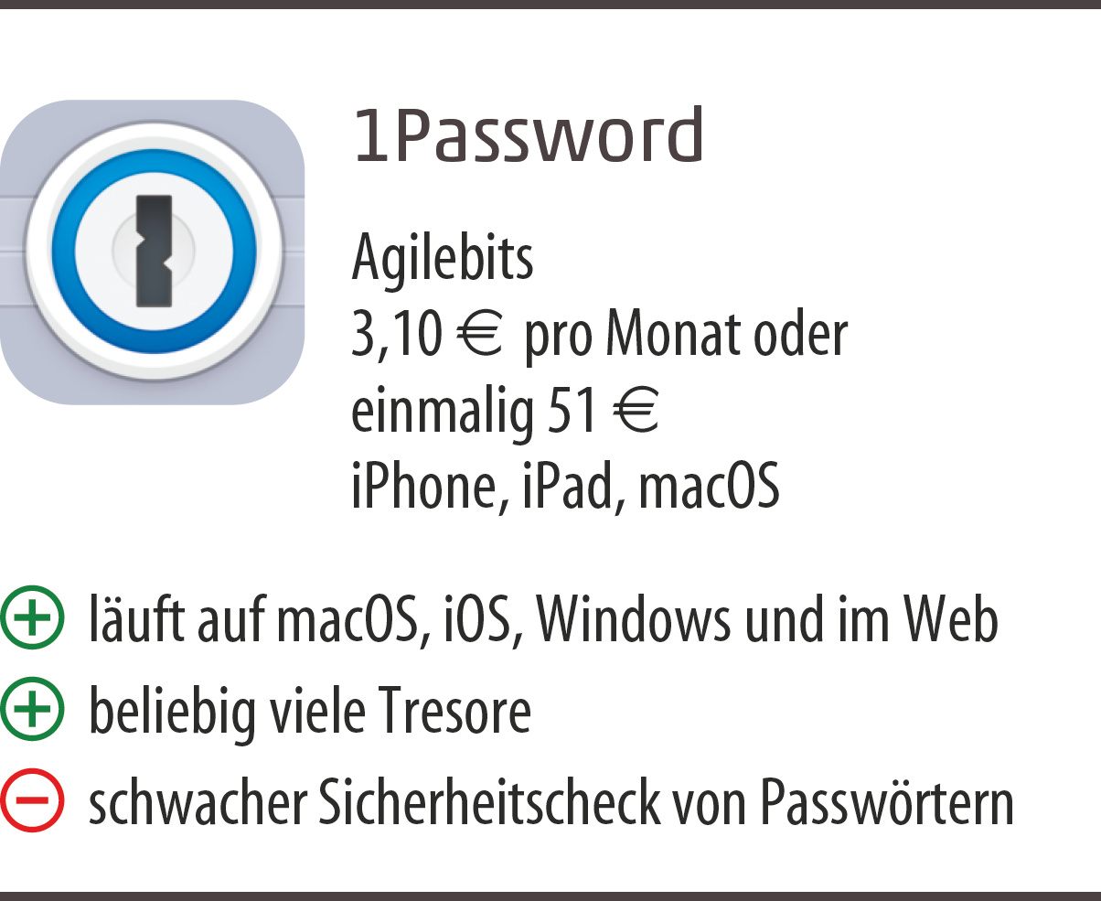 Daten-Tresore wie 1Password helfen, die wachsende Zahl an Log-ins, Pins und Zugangscodes sicher zu verwahren und komfortabel zu nutzen. Merken muss man sich nur noch das Master-Passwort. Der Passwort-Manager von Agilebits macht als macOS-, iOS- und Web-App eine gute Figur, wirkt modern und arbeitet flott. Als einzige Software mit Sync-Funktion unterstützt 1Passwort beliebig viele Tresore – das erleichtert das Aufteilen in Einheiten wie „Privat“ und „Beruf“. Wer den integrierten Sicherheitsdienst „Watchtower“ aktiviert, erhält eine Warnung, sollte er eine kompromittierte Webseite ansteuern. Bestimmte Online-Tresore kann man von seinen Geräten löschen, sobald man den Travel-Mode aktiviert, etwa zum Schutz vor neugierigen Einreisebehörden. 1Password enthält neben den Website-Logins eine Vielzahl von Eingabemasken, unter anderem für Kreditkarten, WLAN-Router, Bankkonten und Notizen. Alle Masken lassen sich individuell anpassen. Der Sicherheitscheck von Passwörtern überzeugt uns allerdings weniger, das extrem schwache „hallo123456“ hält die App zum Beispiel für ein mittelstarkes Kennwort. Der Abopreis schließt die gleichzeitige Nutzung auf allen unterstützten Plattformen ein. Wer kein Abo möchte, muss das Programm für jedes Betriebssystem separat erwerben.