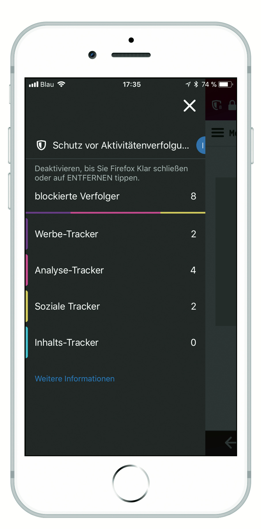 Mehr und mehr Webseiten setzen auf Tracking-Elemente, die – meist eingebettet in Anzeigen-Skripte – Daten sammeln und den Surfenden nachverfolgbar machen. Bei Firefox Klar befindet man sich im Unterschied zu anderen Browsern dauerhaft im privaten Modus, der verhindert, dass besuchte Seiten langfristig im Verlauf landen. Zudem ist der Tracking-Schutz gleich aktiviert und blockiert Analyse- und Werbetracker sowie Anzeigen von gängigen Anbietern. Mobilsurfer sparen dadurch obendrein Datenvolumen.