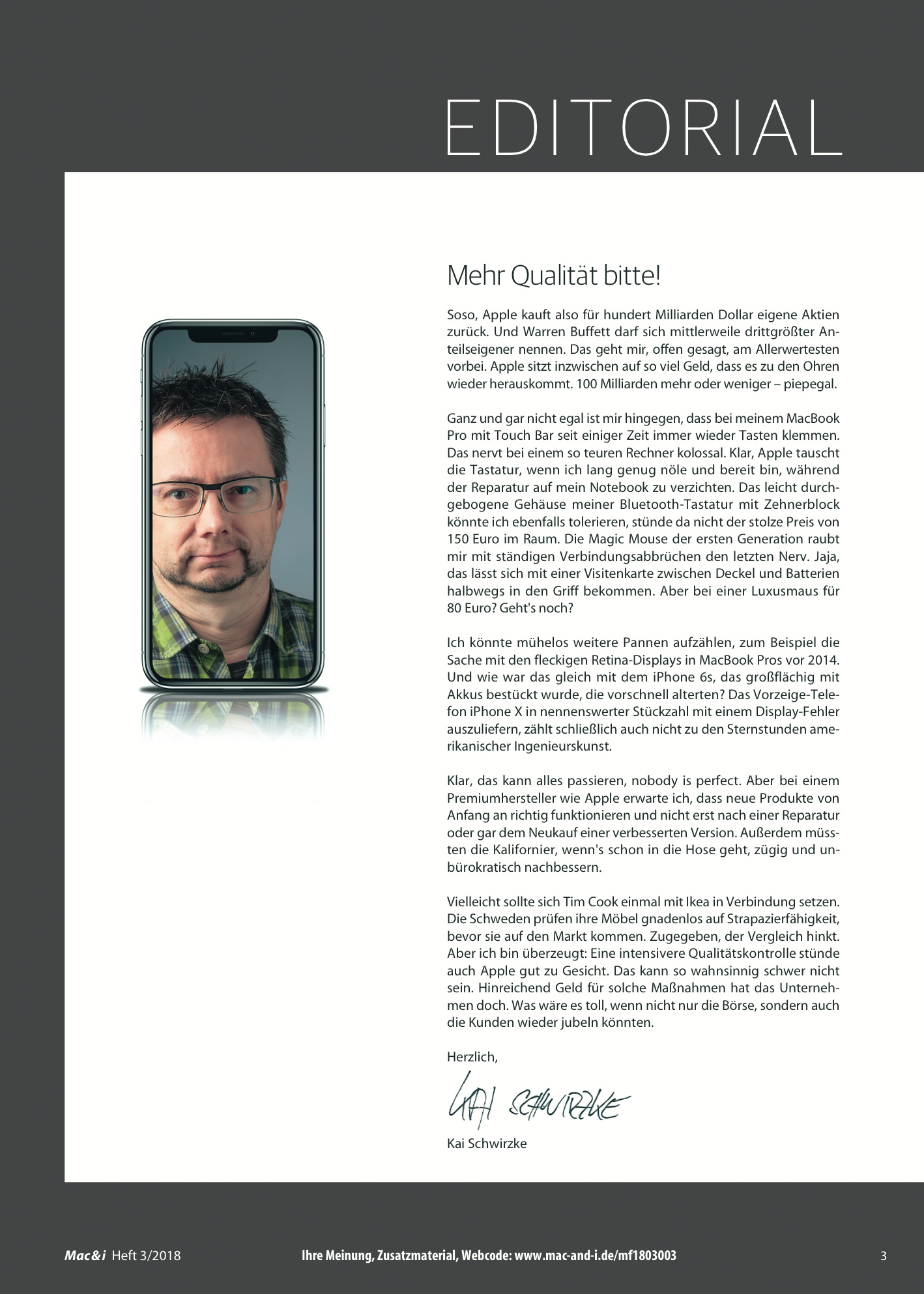 Mehr Qualität bitte! Editorial von Kai Schwirzke, Mac & i Heft 3/2018, S. 3