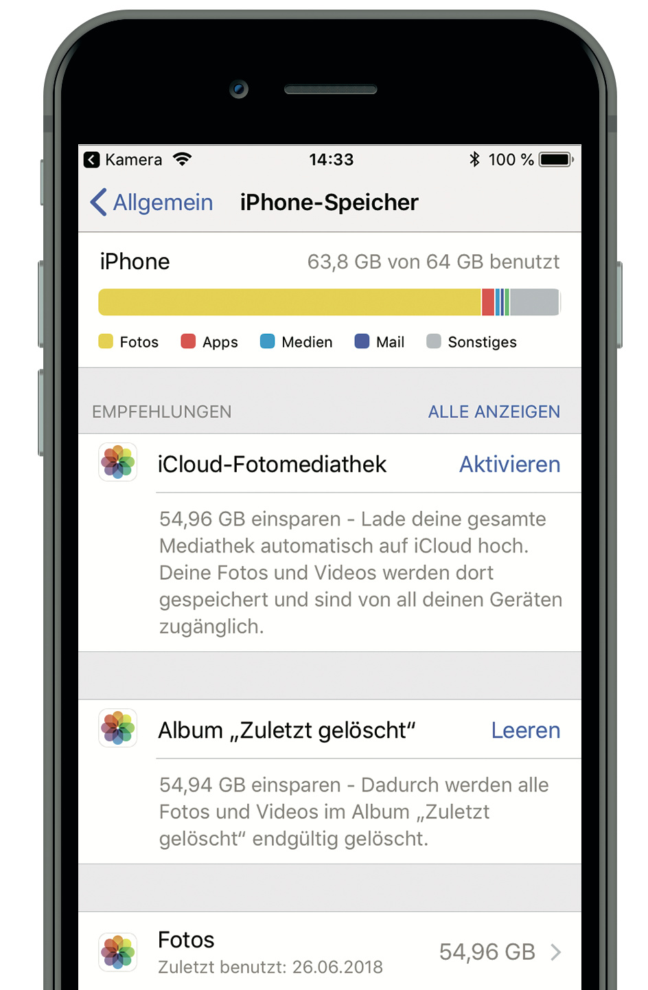 Ich benutze mein iPhone 8 häufig, um 4K-Videos aufzunehmen. Dabei füllen sich die 64 GByte Speicher schnell und die nicht gelungenen Szenen lösche ich in der Fotos-App. Trotzdem kann ich den eigentlich frei gewordenen Speicher nicht nutzen.