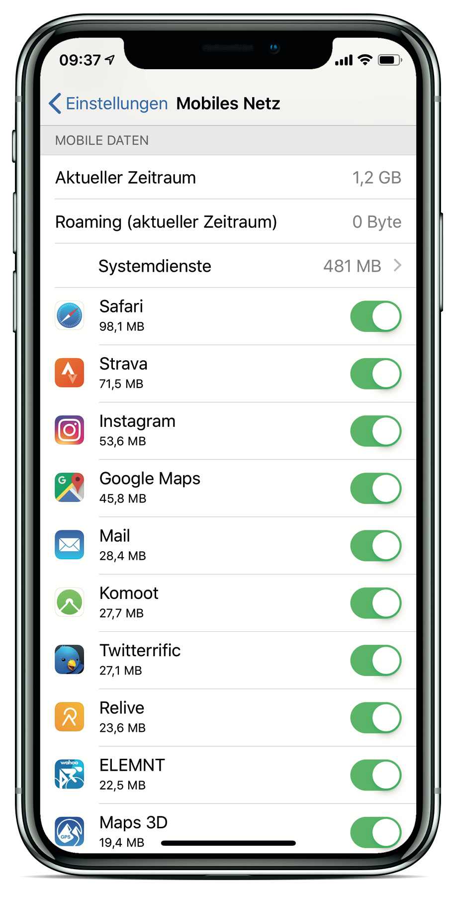 In iOS lässt sich herausfinden, welche Apps das meiste Mobilfunkdatenvolumen verbrauchen: Öffnen Sie die Einstellungen für „Mobiles Netz“ und werfen einen Blick in den unteren Abschnitt „Mobile Daten“. iOS 12 sortiert die Apps sinnigerweise nach ihrem Datenverbrauch und nicht mehr alphabetisch; Sie sehen also die größten Datenfresser ganz oben. Achtung: Die WLAN-Unterstützung – das automatische Umschalten auf mobile Daten bei schlechter WLAN-Verbindung – wird unabhängig von dieser Liste aufgeführt und erscheint erst, wenn Sie an allen installierten Apps vorbei nach unten scrollen.