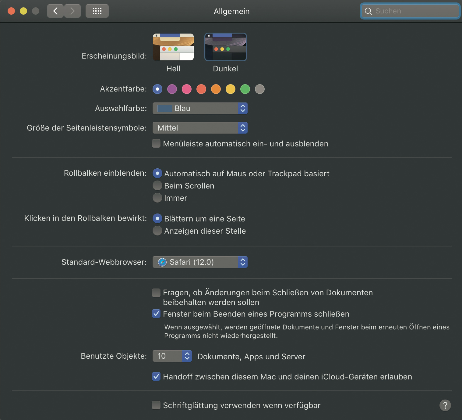 Sie können zwischen beiden Varianten jederzeit in den Systemeinstellungen unter „Allgemein/Erscheinungsbild“ umschalten. Was Apple bei älteren macOS-Versionen als Option „Erscheinungsbild“ bezeichnet hat, um Menüauswahl, Fenster und Tasten in Blau oder Graphit zu färben, heißt in Mojave „Akzentfarbe“ – mit nun acht statt nur zwei Farbvarianten. Für unseren Geschmack eignen sich die hinzugekommenen Töne besser im Dunkelmodus, probieren Sie es aus!