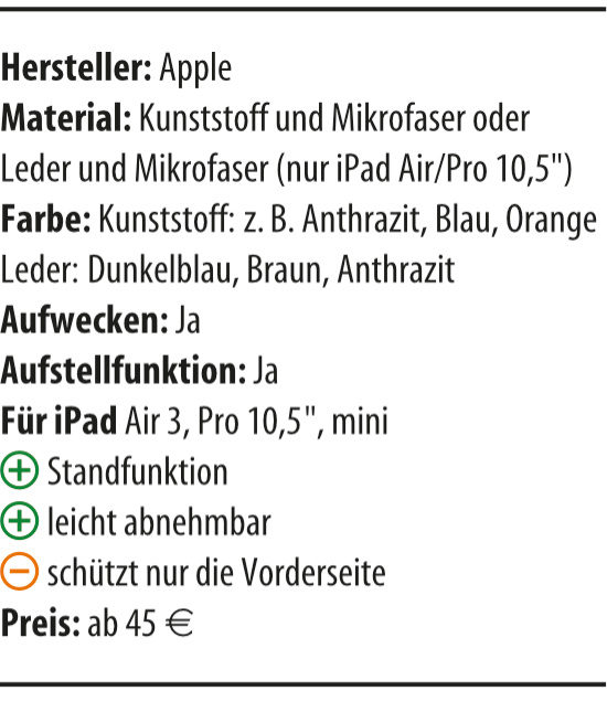 Das Smart Cover haftet mittels Magneten an der linken Seite eines iPads und deckt dessen Display-Glas vollständig ab. Im Cover eingenähte Magnete halten es sicher an seinem Platz und heben beim Aufklappen den Ruhezustand auf. Die Rückseite lässt Apple leider frei, ebenso die Gehäusekanten. Das Smart Cover lässt sich zu einem Dreieck zusammenfalten, sodass man das iPad zum Tippen leicht erhöhen kann. Es steht so auch zum Videoschauen oder für FaceTime-Konferenzen aufrecht auf der Seite. Für die 10,5-Zoll-iPads bietet Apple eine teurere Leder-Version an.