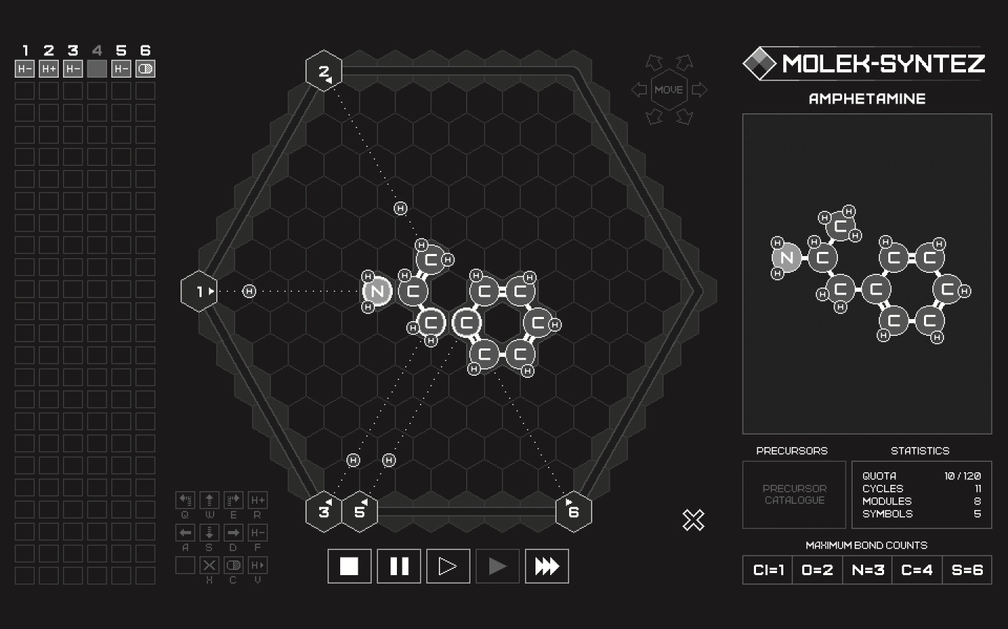 Drogen versprechen bunte Trips und eine Flucht aus dem grauen Alltag. Als das komplette Gegenteil präsentiert sich Molek-Syntez. In minimalistischer Schwarzweiß-Optik werden in dem Puzzlespiel Moleküle kombiniert und manipuliert, um den gewünschten Wirkstoff zu erzeugen. Die Ergebnisse sind mal mehr, mal weniger harmlose Produkte von Ethanol bis Amphetamin.