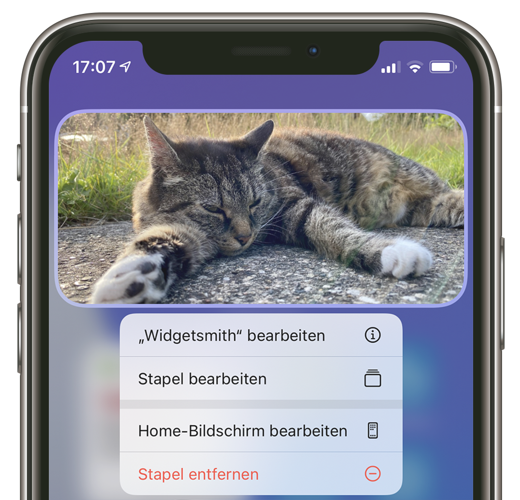 Kehren Sie nun zum Home-Bildschirm zurück und fügen Sie ihm das Widget „Widgetsmith“ hinzu (siehe Tipp 5). Öffnen Sie dessen Einstellungen über das Kontextmenü (siehe Tipp 7). Mit der Option „Widget“ bestimmen Sie nun, welches in Widgetsmith konfigurierte Layout angezeigt werden soll, etwa „Lieblingskatze“. Hier zahlt sich aus, wenn Sie selbsterklärende Namen verwendet haben.