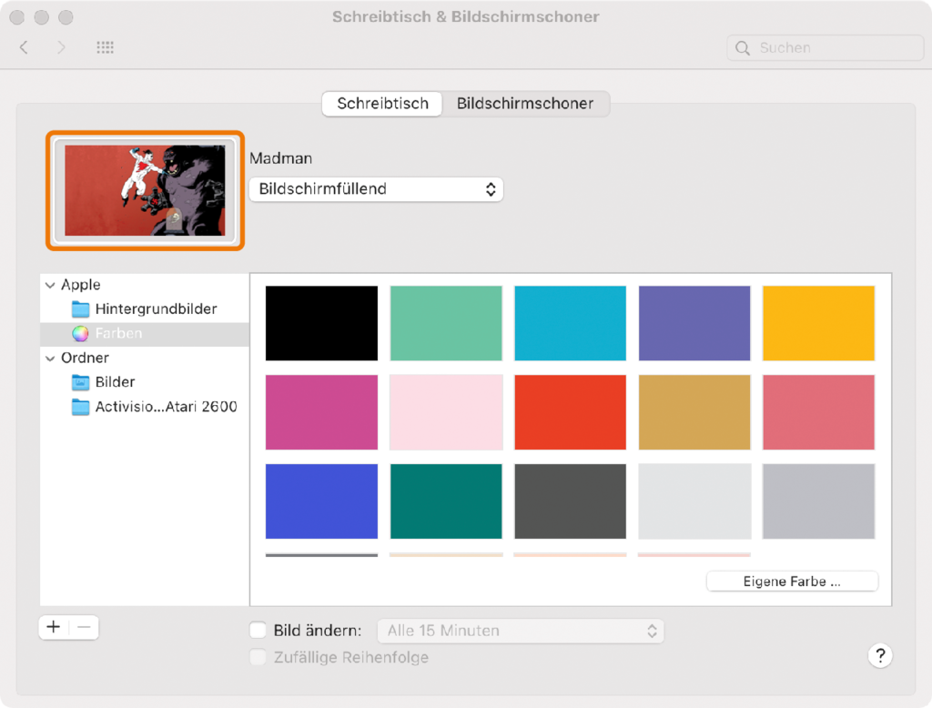 Öffnen Sie die Systemeinstellung „Schreibtisch & Bildschirmschoner“ oder klicken Sie im Desktop-Kontextmenü auf den Befehl „Schreibtischhintergrund ändern“. Dort können Sie eines der zahlreichen mitgelieferten Motive auswählen. Möchten Sie ein eigenes Bild verwenden, ziehen Sie es einfach auf das Vorschaubild in der linken oberen Ecke der Systemeinstellung. Über das nebenstehende Drop-Down-Menü bestimmen Sie unter anderem, ob macOS das Bild zentriert, gekachelt oder bildschirmfüllend anzeigen soll.