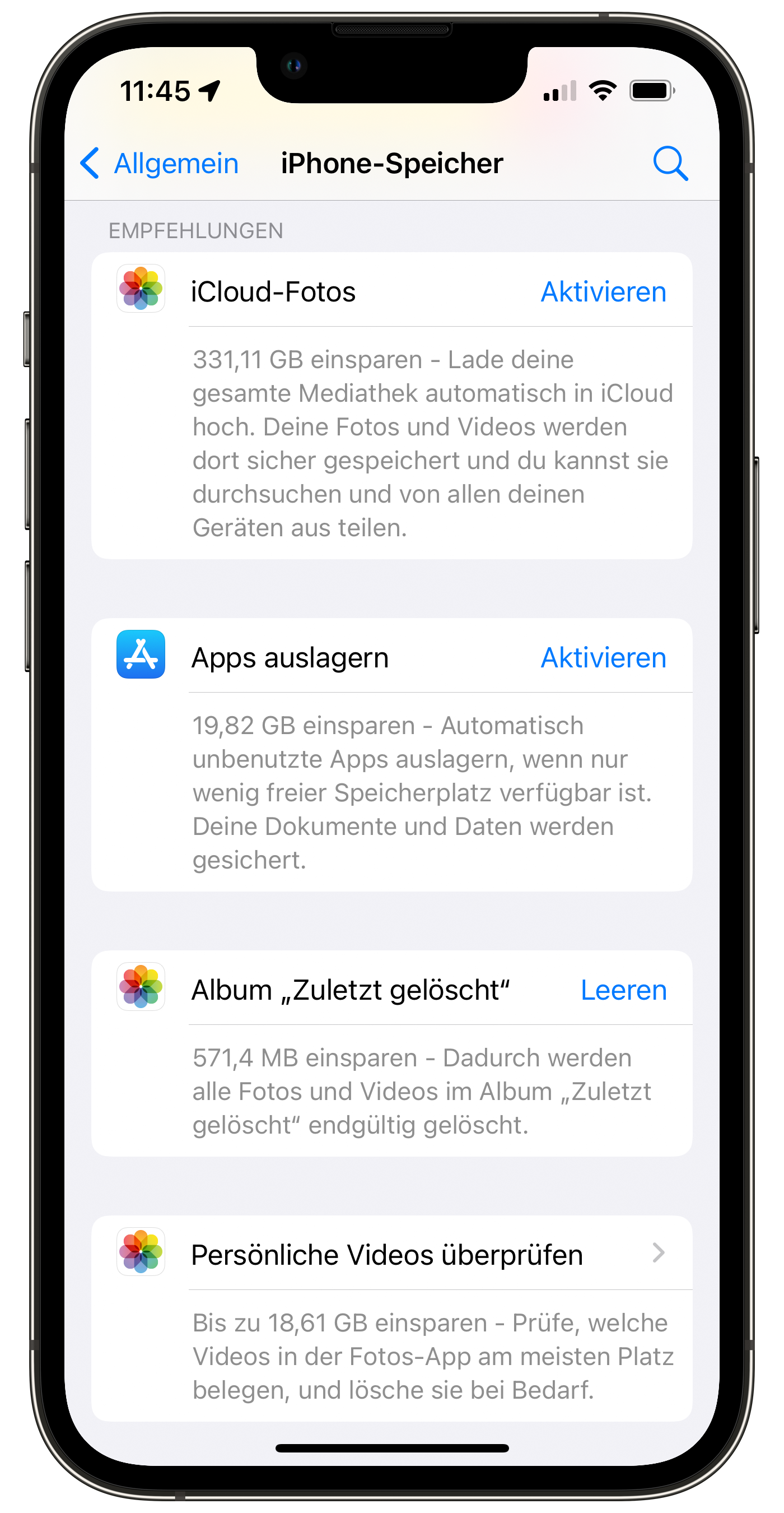 Welche Dateien oder Apps belegen besonders viel Speicherplatz? Werfen Sie zuerst einen Blick in den Bereich „iPhone-Speicher“ beziehungsweise „iPad-Speicher“ der Einstellungen unter „Allgemein“. Tippen Sie – sofern vorhanden – auf „Alle anzeigen“, um die Empfehlungen des Systems einzusehen. Welche iOS beziehungsweise iPadOS anzeigt, hängt von der Speicherbelegung auf Ihrem Gerät ab. Manche davon könnten für Sie sinnvoll sein, andere wiederum nicht. Der Vorschlag „iCloud-Fotos aktivieren“ dürfte Ihr Speicherproblem in die Cloud verschieben oder Abozahlungen zur Folge haben. Starten Sie lieber bei anderen Empfehlungen: „Album ‚Zuletzt gelöscht‘“ können Sie gleich antippen. Hierbei leert iOS den Papierkorb der Fotos-App, der gelöschte Bilder rund vier Wochen aufhebt.