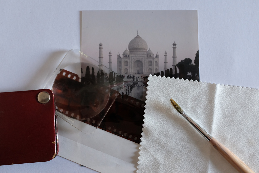 Mit Lupe, Pinsel, Brillenputztuch sowie ein wenig klarem Wasser sind Fotos schnell gereinigt.