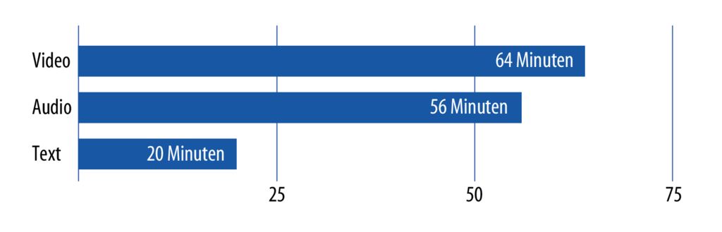 227 Minuten nutzen Menschen ab 14 Jahren in Deutschland jeden Tag das Internet. Davon verwenden sie 136 Minuten darauf, Medien zu konsumieren – und nur ein kleiner Teil davon entfällt auf Texte.