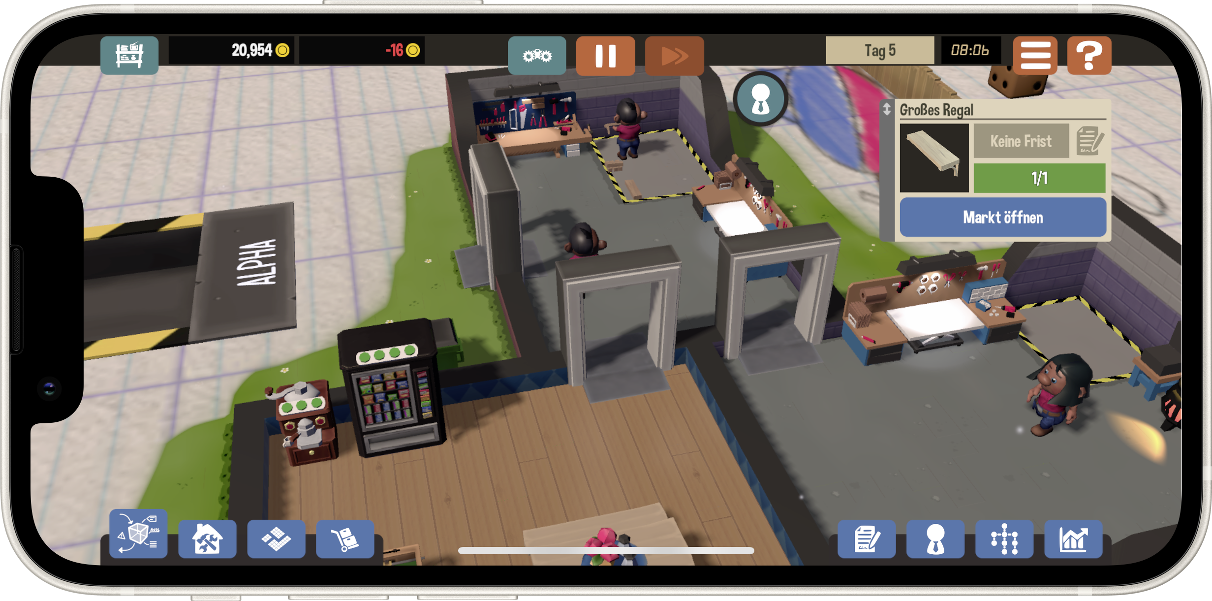 Dass der Weg zum Industriemagnaten kein Zuckerschlecken ist, vermittelt Little Big Workshop bereits in der Einführung. Um einfache Holzgartenzwerge zu produzieren, muss der Firmengründer das Werksgebäude mit Maschinen ausstatten und Produktionslinien festlegen. Sind die passenden Rohstoffe eingekauft, sollte man für das Wohl der Mitarbeiter sorgen, damit niemand während der Nachtschicht erschöpft zusammenbricht.