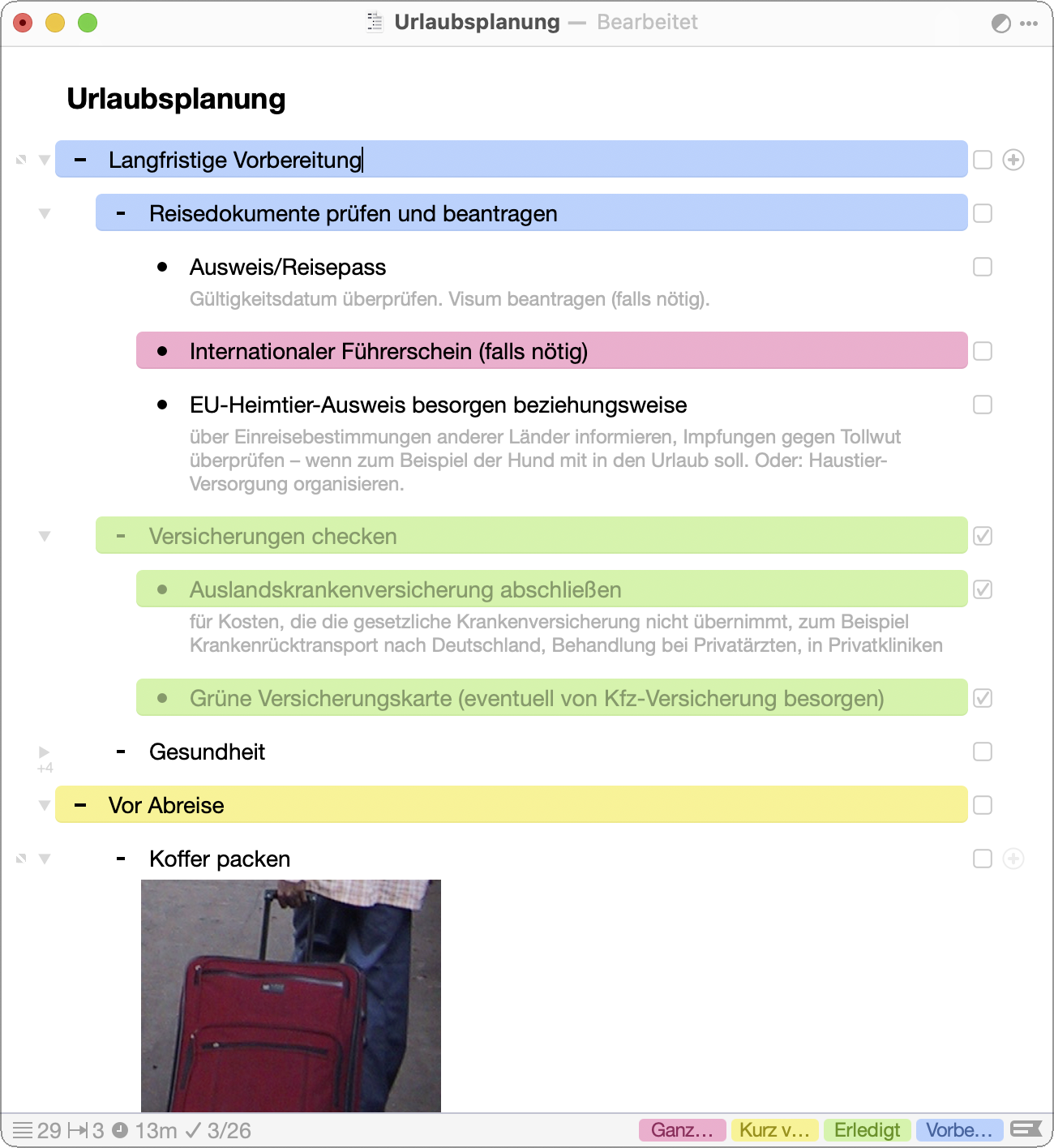 Mit einem Outliner listet man die wichtigsten Punkte auf und ergänzt in Unterpunkten weitere Details. Für einen groben Überblick klappt man die Unterpunkte dann einfach zu. OutlineEdit bindet zusätzlich Bilder ein und beherrscht Formatierungen wie Fett und Kursiv. Zudem kann man kleine graue Notiztexte ergänzen, die sich aber nicht ausblenden lassen. Auf Wunsch erscheinen im gesamten Dokument Checkboxen zum Abhaken. Links lassen sich nur als URL einfügen, aber nicht direkt mit Text verknüpfen. Verlinkte URLs sind aber nachträglich bearbeitbar.