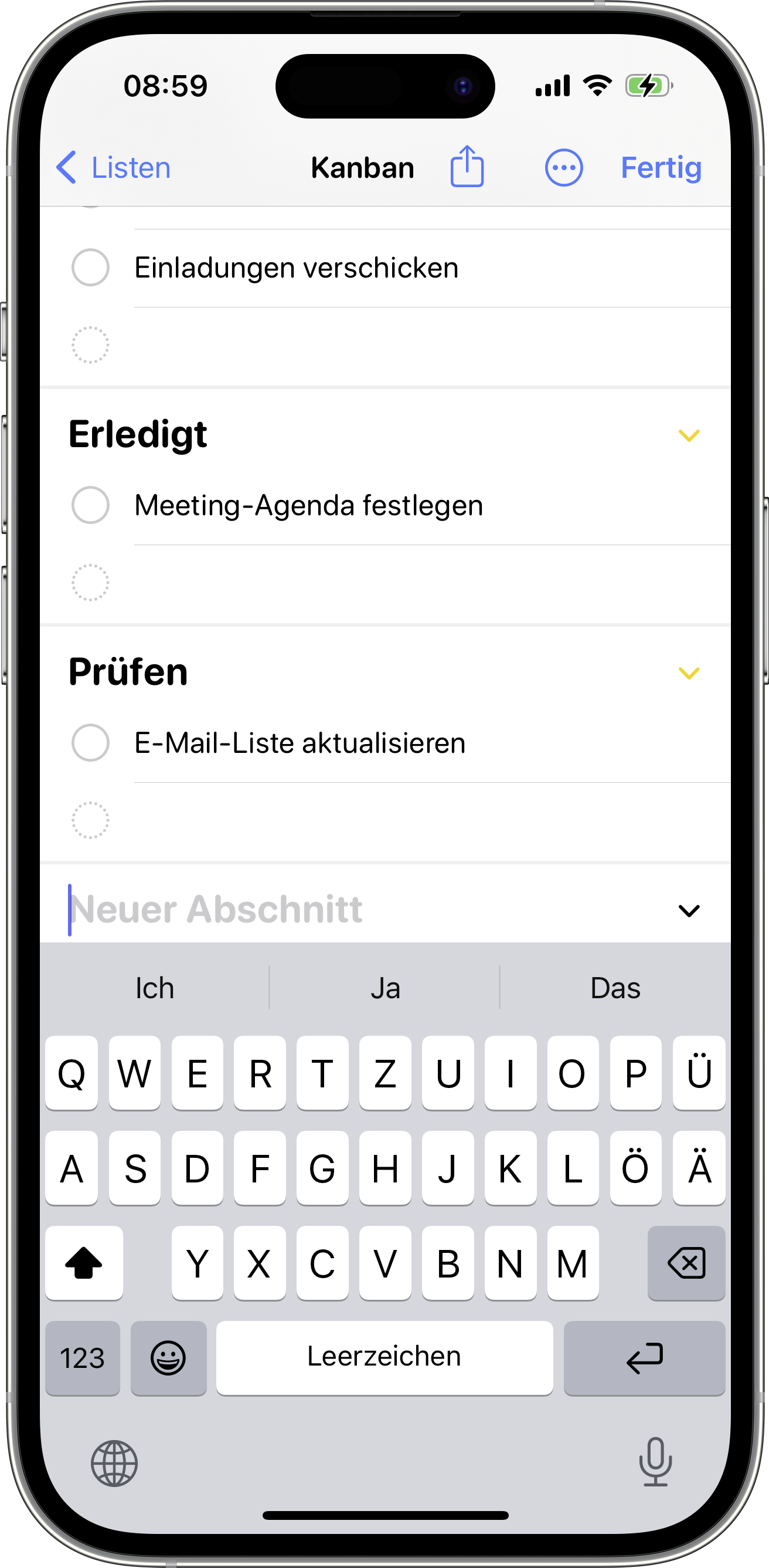Öffnen Sie eine Liste und tippen Sie unter iOS / iPadOS oben rechts auf den Kreis-Button mit den drei Punkten. Wählen Sie aus dem Menü „Neuer Abschnitt“ und tragen Sie einen Überbegriff ein, um die Liste dadurch besser zu strukturieren. Sind bereits Abschnitte in der Liste, müssen Sie erst auf „Abschnitte verwalten“ tippen, um einen neuen Abschnitt anzulegen. In macOS fügen Sie einen neuen Abschnitt mit dem neuen Icon links neben dem Plus-Button in der Symbolleiste hinzu. Sie erreichen den Befehl auch im Menü „Ablage > Neue Spalte“. Alternativ gibt es das Kürzel Command + Option + N.