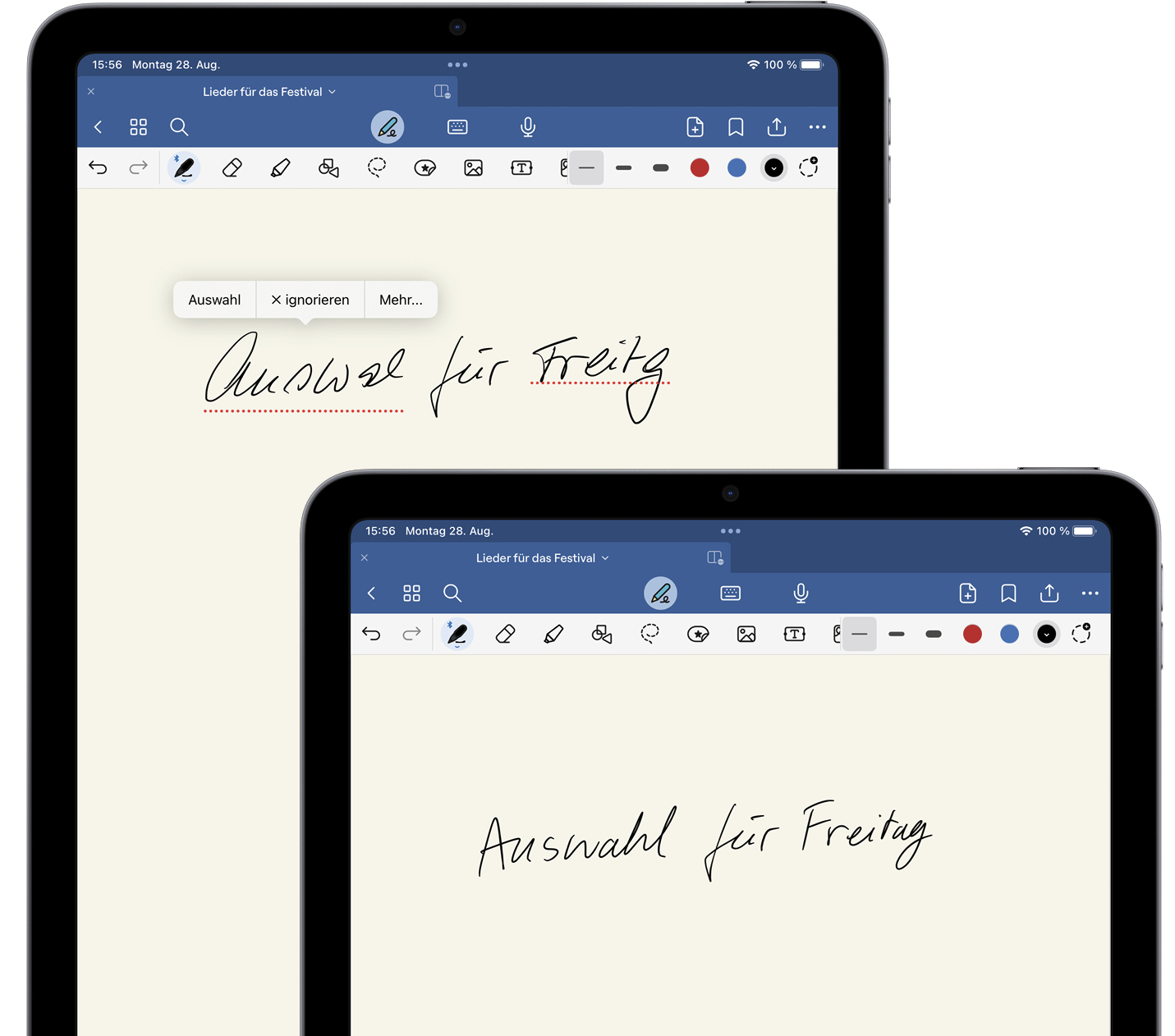 Goodnotes ist eine Notizen-App, die auf dem iPhone, dem iPad und dem Mac seit Jahren viel Zuspruch erhält. Schüler und Studenten etwa versehen damit importierte Vorlesungsskripte mit ihren eigenen Notizen. Die Ordner für deren Aufbewahrung lassen sich in Goodnotes 6 nun erstmalig einfärben und dadurch leichter unterscheiden. Wer auf dem iPad mit dem Pencil schreibt, konnte seine Notizen bereits in der Vergangenheit transkribieren, um sie beispielsweise in einen Termin zu übernehmen. Vor allem dort, auf dem iPad, will Goodnotes 6 nun das Nutzererlebnis noch einmal deutlich verbessern. Die App prüft bereits während des Schreibens mit dem Apple Pencil mögliche Rechtschreibfehler und unterstreicht sie mit einer gepunkteten Linie, wie aus der Textverarbeitung bekannt. Tippt man mit dem Finger darauf, schlägt Goodnotes Verbesserungen vor, die man nur noch bestätigen muss. Das Besondere dabei: Eine KI gleicht die Korrektur an das Schriftbild des Nutzers an, damit sie sich möglichst unauffällig in dessen Handschrift einfügt. Das funktioniert nur bedingt, im Test sahen die eingefügten Buchstaben schon etwas anders aus. Sie fielen aber auch nicht als Fremdkörper auf. Wer mithelfen möchte, die Ergebnisse zu verbessern, erlaubt der KI respektive Goodnotes, seine Handschrift zum Lernen zu verwenden.