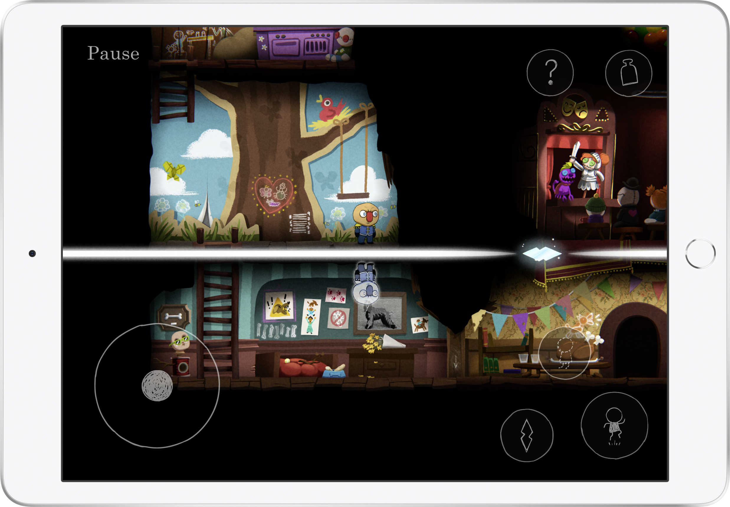 Diesen spielmechanischen Kniff baut der Plattformer sukzessive aus. Je nach Positionierung des Splitters im Raum oder auf dem Boden kann das Spiegelbild sich horizontal in die andere Bildschirmhälfte bewegen oder diese in Höhe und Tiefe erkunden. Wechselt man zum Spiegelbild, erreicht man zuvor unzugängliche Areale. Das erinnert an den Indie-Klassiker Braid, der jedoch nie für Apples Mobilgeräte erschienen ist.