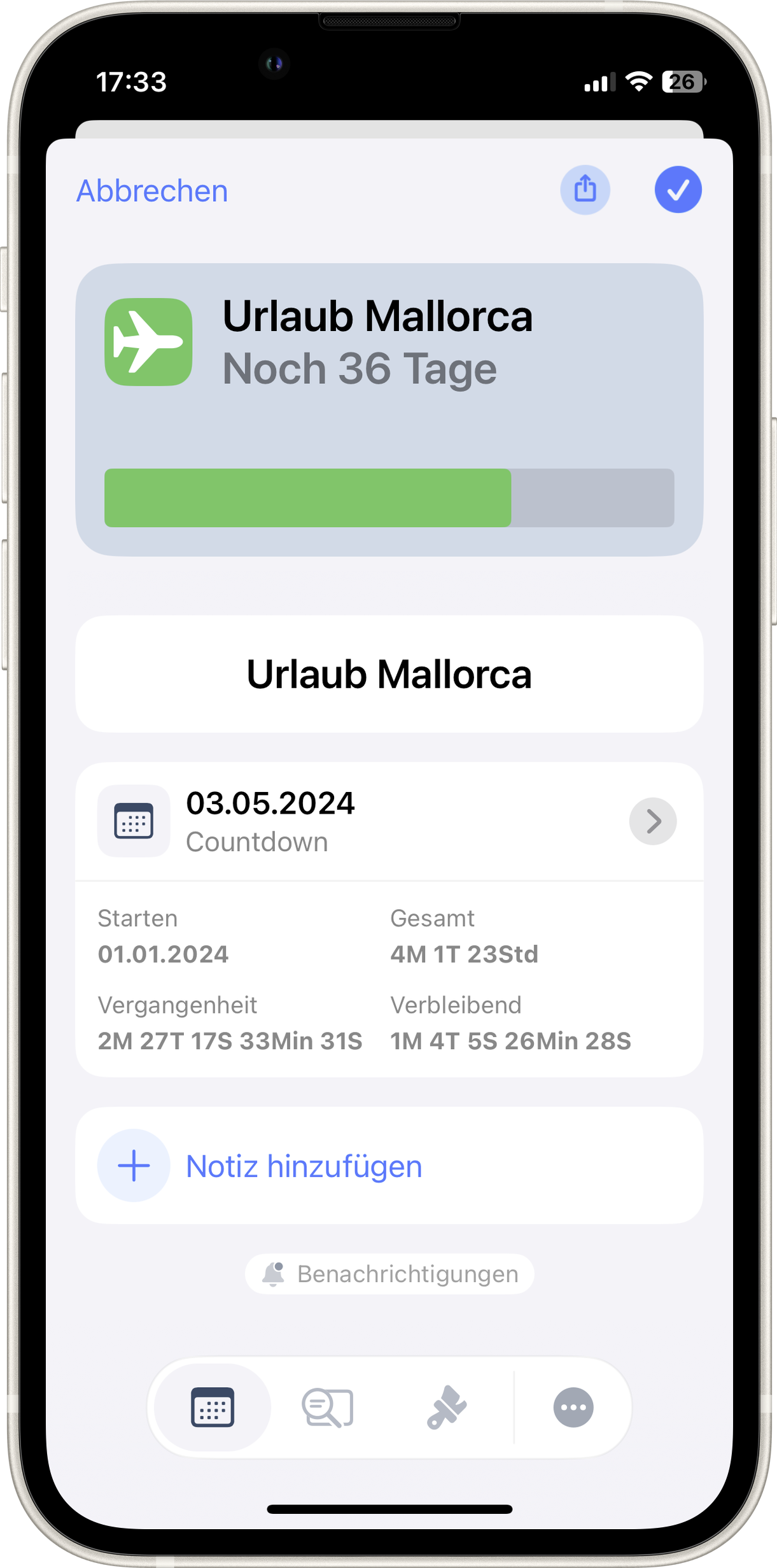 Die App gestaltet hübsche Widgets für alle Apple-Systeme. Sie helfen per grafischer Fortschrittsanzeige oder Countdown, künftige Ereignisse oder erreichte Ziele im Blick zu behalten. Das können etwa Geburtstage, Abstinenzzeiten oder die verbleibenden Tage bis zum Urlaub sein.