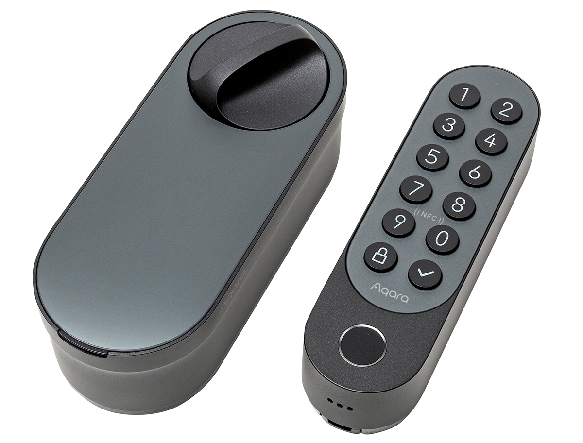 Zum U200 gehört neben der Schließeinheit ein Keypad mit NFC- und Fingerabdrucksensor. Das Keypad schraubt man außen an der Wohnungstür an. Das Schloss steckt man auf einen Euro-Schließzylinder mit eingestecktem Schlüssel auf die Innenseite der Wohnungstür. Aqara legt Distanzstücke für Schließzylinder bei. Ragt der Schließzylinder mehr als 3 Millimeter heraus, lässt sich das U200 mit einer Trägerplatte am Zylinder festklemmen. Ist der Zylinder kürzer, lässt sich die Platte entweder an der Tür anschrauben oder mit einem Klebepad ankleben, was im Test gut hielt. Für das recht ausladende Schloss muss man unter Umständen die Zylinderrosette von der Tür abschrauben, damit es bündig sitzt.