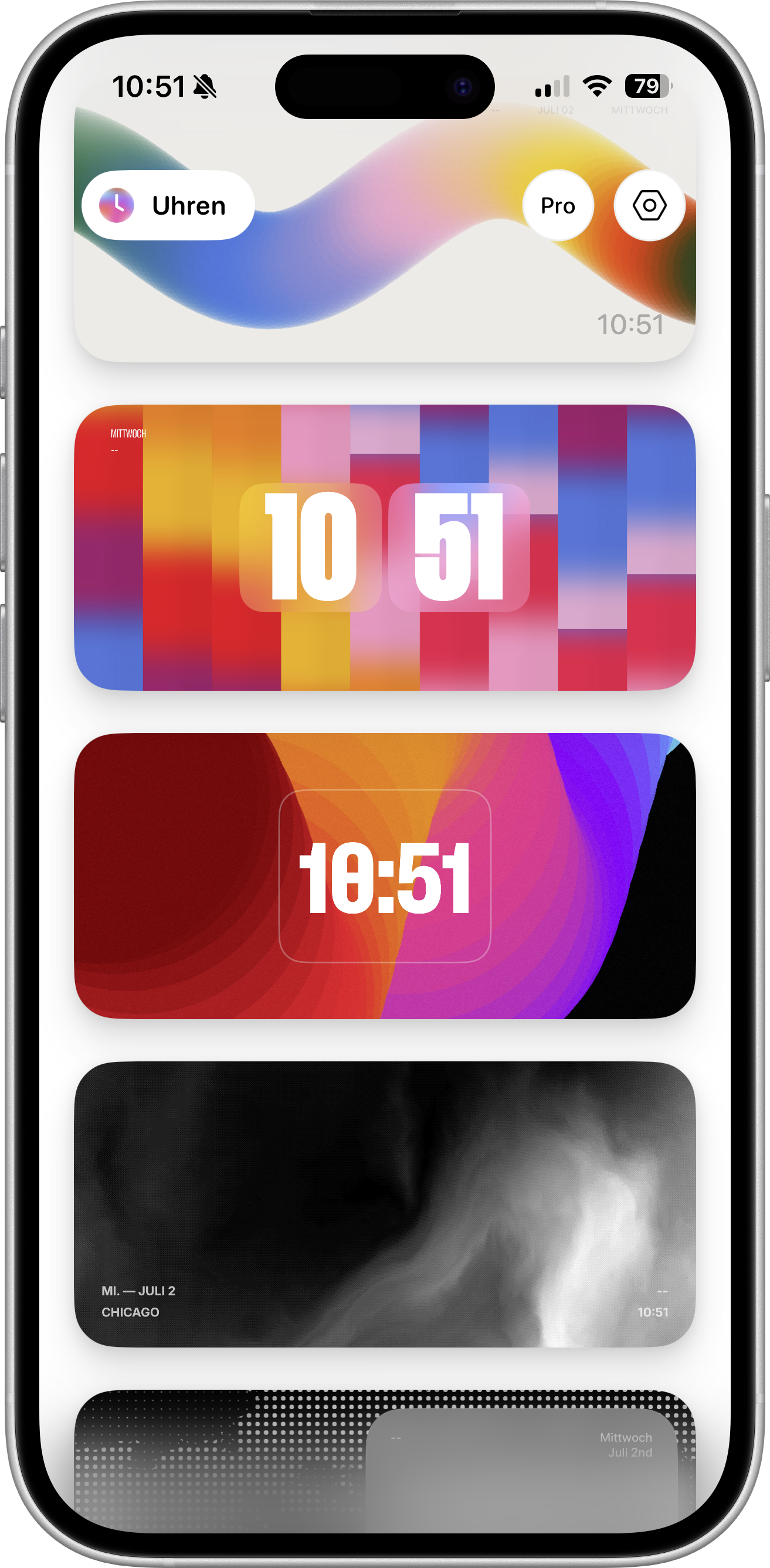 Die zehn individualisierbaren Layouts der Vollversion unterscheiden sich in Gestaltung und Informationsdichte deutlich voneinander. Die meisten Gestaltungen ziert eine große Zeitanzeige – von schlichter Analoguhr über klassische Digitalzeitmesser bis hin zu Flip-Uhren. Einige Designs liefern auch Informationen zu Wochentag, Datum und Ort sowie über die aktuelle Temperatur von Apples Wetter-Dienst. Die Textfarbe ist frei wählbar, teilweise auch der Font.
