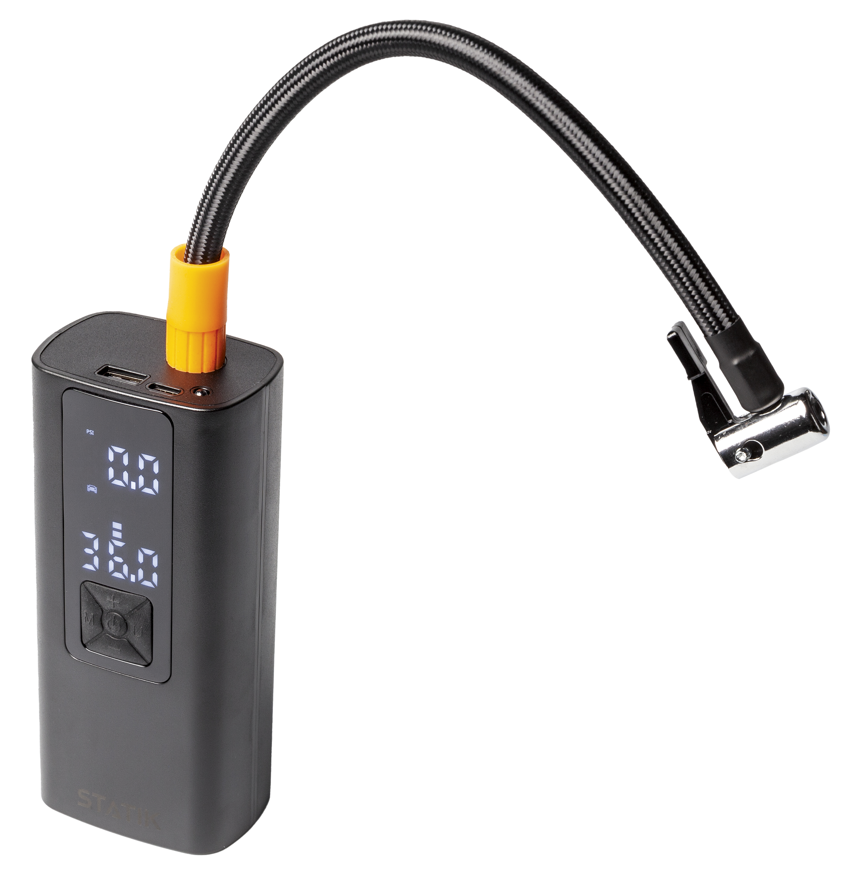 Statik hat sich für seinen TireHero eine ungewöhnliche Kombination ausgedacht: Er enthält eine Powerbank mit 22,2 Wattstunden Kapazität und einen Kompressor mit 10,3 bar Druckleistung. Für Letzteres liegt zum Anschrauben ein 29 Zentimeter kurzer Schlauch für Autoventile sowie Adapter für Fahrrad, Bälle und zwei konische Universal-Aufsätze bei.