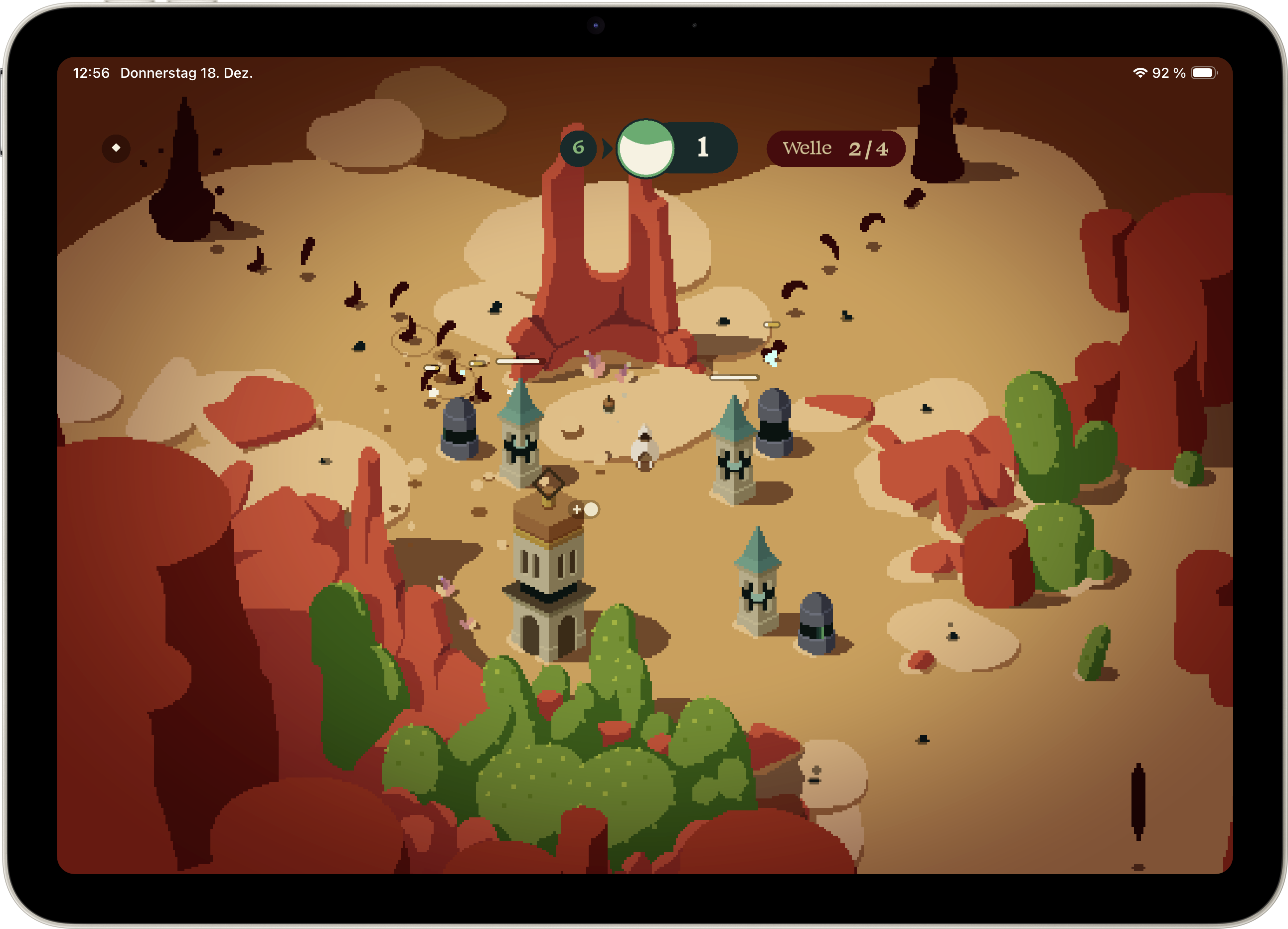 Ein in einen Mantel gewandetes Männlein landet in einer kargen Plateaulandschaft. Dort errichtet es einen „Extraktor“ genannten Turm, den es zu beschützen gilt. Daher stellt man an wenigen, vorbestimmten Plätzen weitere Türme auf, die heranstürmende Feinde beschießen, zurückwerfen oder vernichten sollen. Steht die zunächst noch rudimentäre Verteidigung, startet man die Runde und die Gegner greifen an. Die Figur navigiert man bequem mit einem Daumen. Per Tipp auf den Bildschirm zieht sie die Bauten hoch oder löst die nächste Angriffswelle aus.
