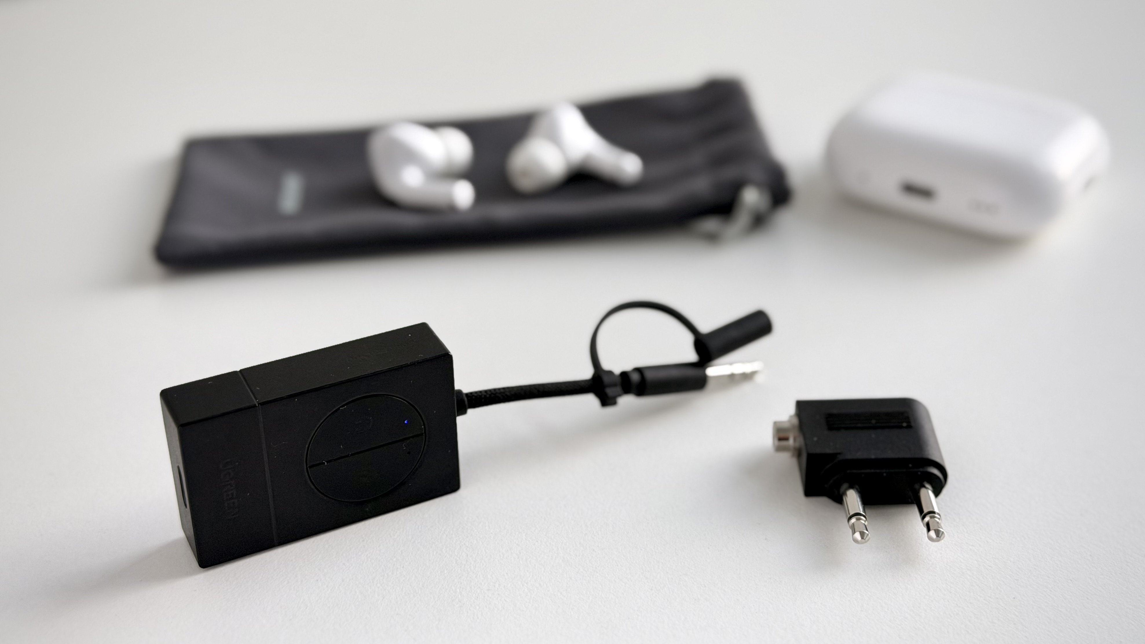 Der Ugreen-Bluetooth-Transmitter überträgt Audio auf die AirPods Pro.