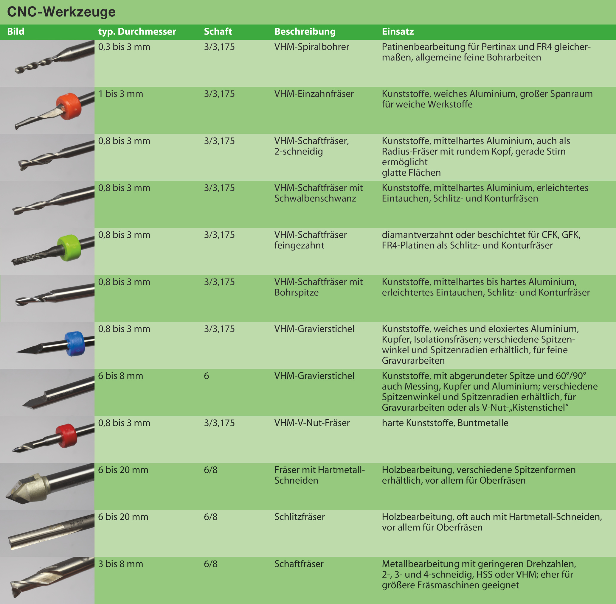 Es gibt bei Fräsern, Graviersticheln und Bohrern eine unüberschaubare Artenvielfalt, aber nur wenige kommen für kleine CNC-Maschinen in Frage – und die wollen wir hier kurz vorstellen.
