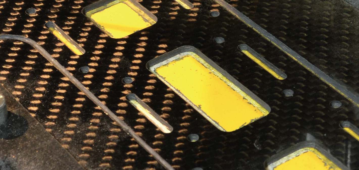 Bei eher f lachen Teilen ist ein Vakuumtisch das Nonplusultra. Hier presst der umgebende Luftdruck das Werkstück auf die Grundplatte – je nach Auslegung mit 500 g bis 1 kg pro Quadratzentimeter (aus anschaulichen Gründen verkneifen wir uns hier die korrekte Angabe in Newton oder Pascal). Eine Eurokarten-Platine (160 cm2 ) wird also mit bis zu 160 kg festgehalten. Für optimale Ergebnisse deckt man die unbenutzten Löcher mit einer Gummimatte ab. Ein Vakuumtisch (70 bis 400 Euro, z.B. von www.vakuumtisch.de) benötigt eine Drehschieber-Vakuumpumpe (ab 80 Euro, z. B. aus dem Klimatechnik-Klempnerbedarf). — cm
