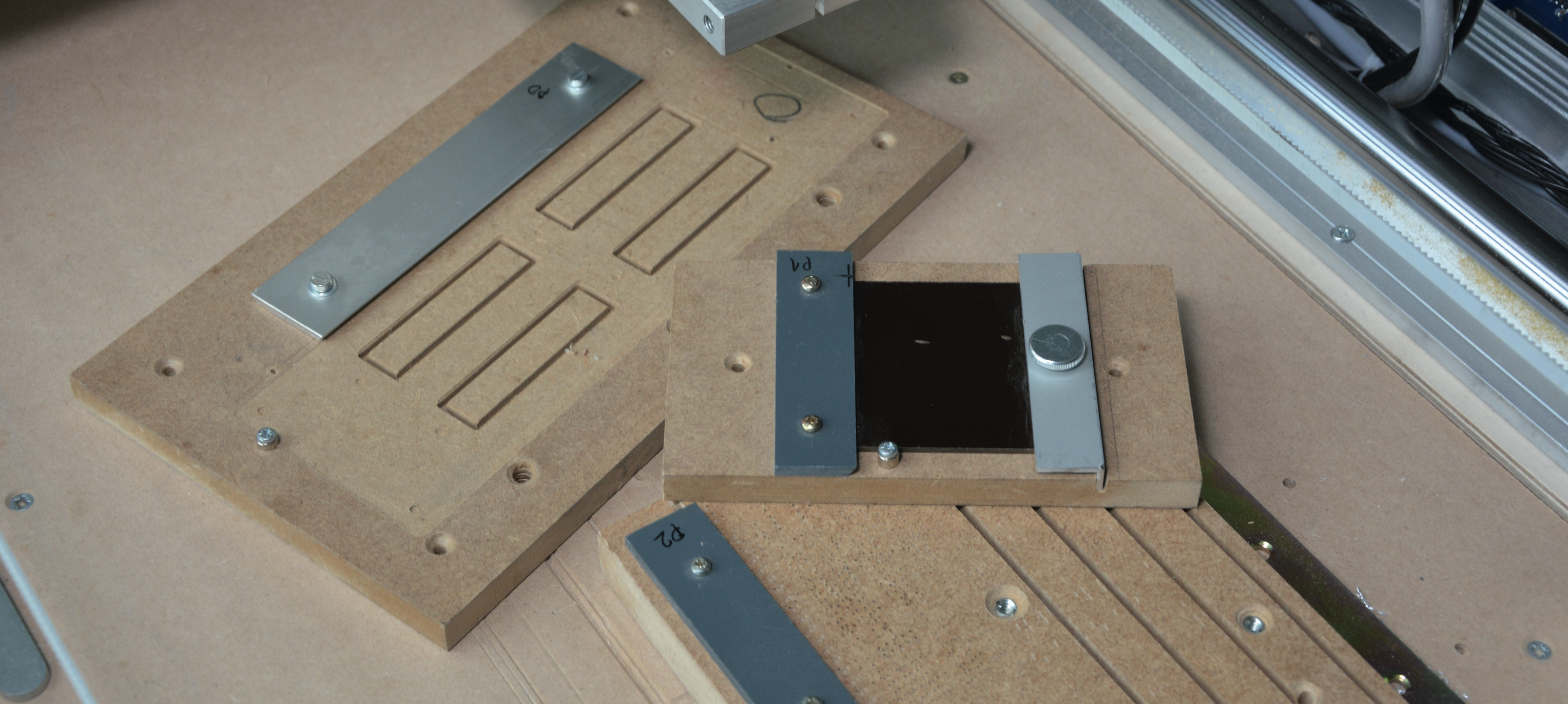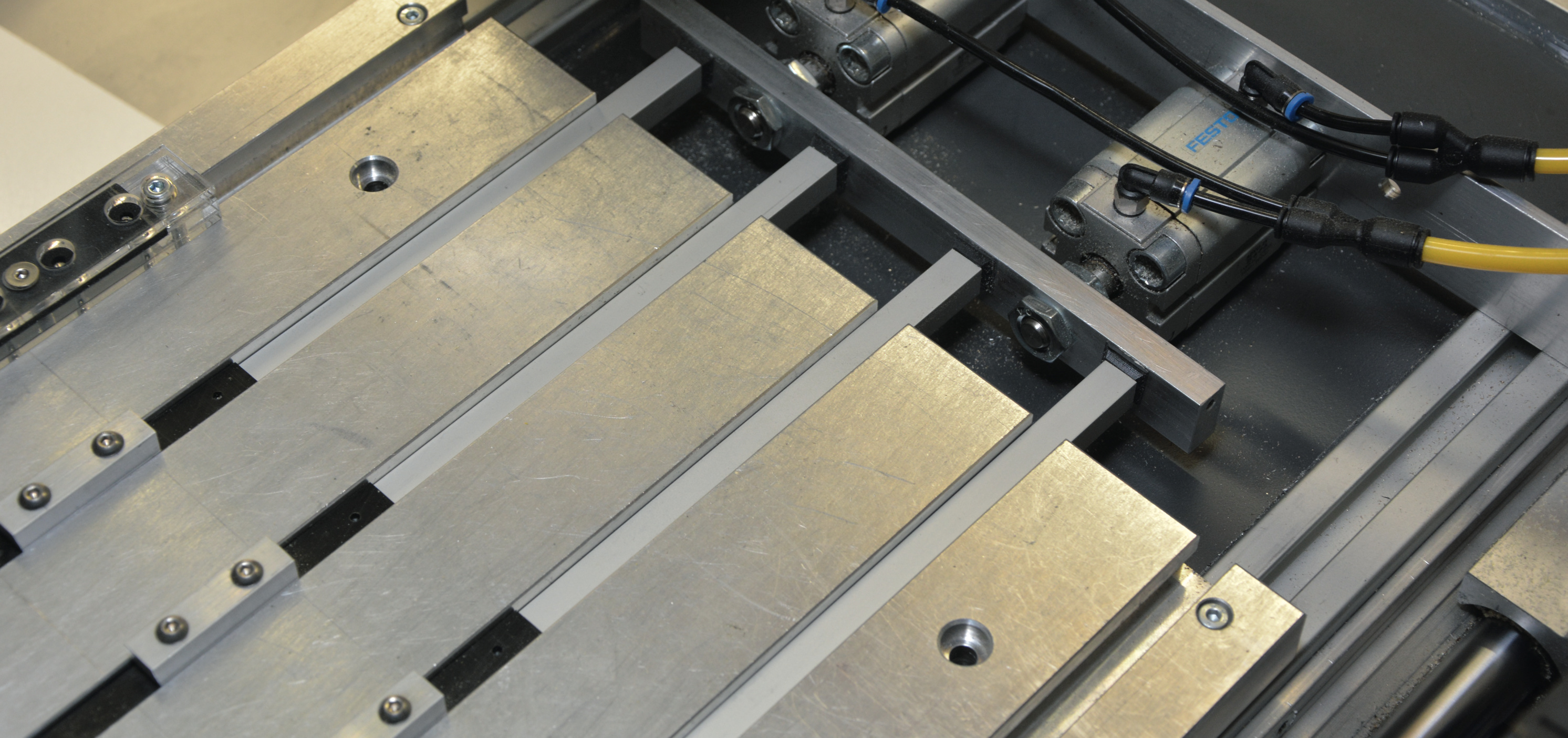 Diese s elbstgebaute Spannmöglichkeit haben wir uns von einer professionellen Platinenbohrmaschine abgeguckt. Vier nahezu spielfrei laufende Schlitten aus POM-Kunststoff werden durch die T-Nuten des Maschinentisches geführt und mit zwei Pneumatikzylindern gegen das Werkstück gepresst. Die nur wenig aus dem Tisch ragenden Halterungen sind leicht nach unten abgeschrägt, sodass das Werkstück immer auf den Maschinentisch gedrückt wird. Durch verschieden lange Schubstäbe lassen sich auch größere Platten sicher spannen.
