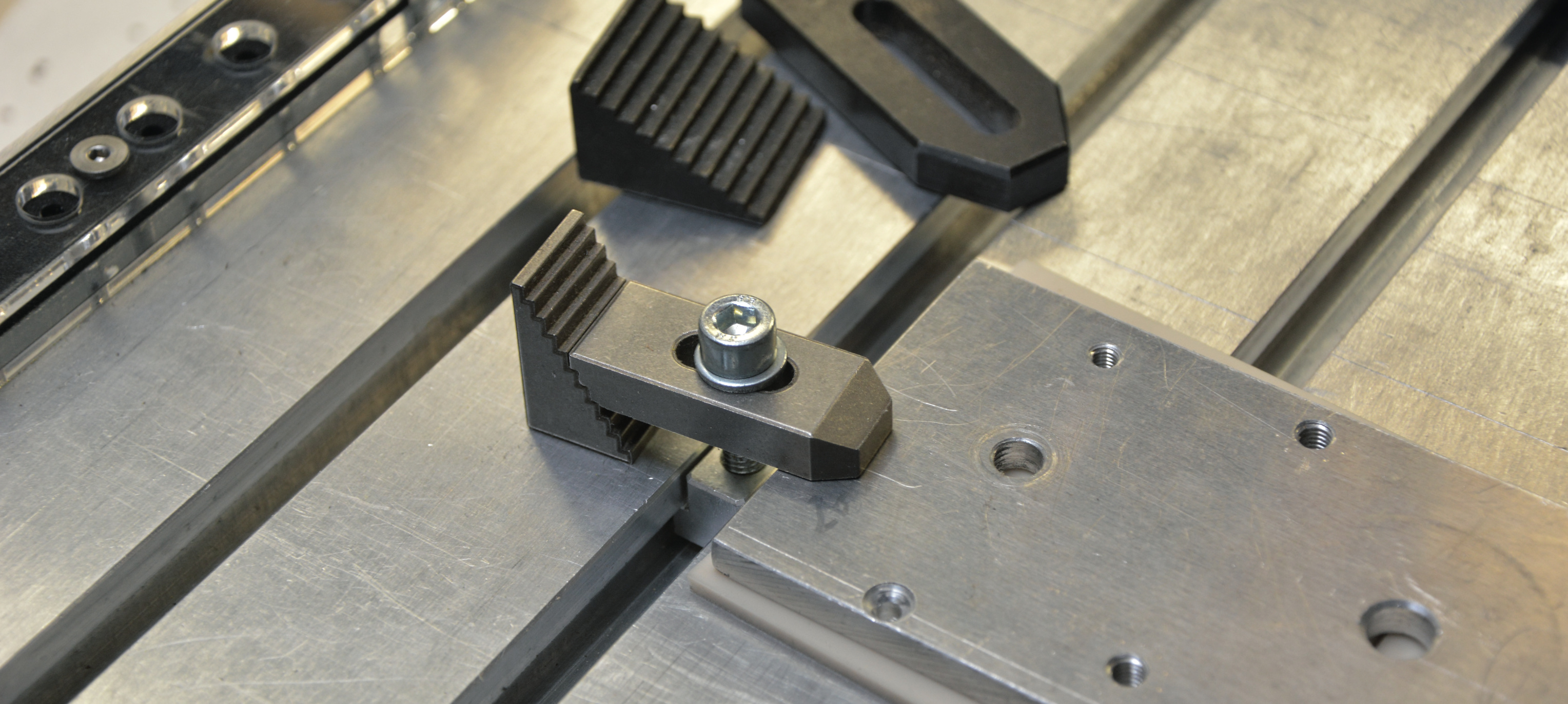 Die p rofessionelle Alternative zum Festschrauben sind die so genannten Spannpratzen: Die mit einem Langloch versehenen Riegel (ab 20 Euro pro Satz) lassen sich durch untergelegte Treppchen auf verschiedene Werkstückhöhen einstellen. Sie eignen sich vor allem für Maschinen mit einer T-Nutenplatte; dort können sie mit Nutensteinen variabel befestigt werden.