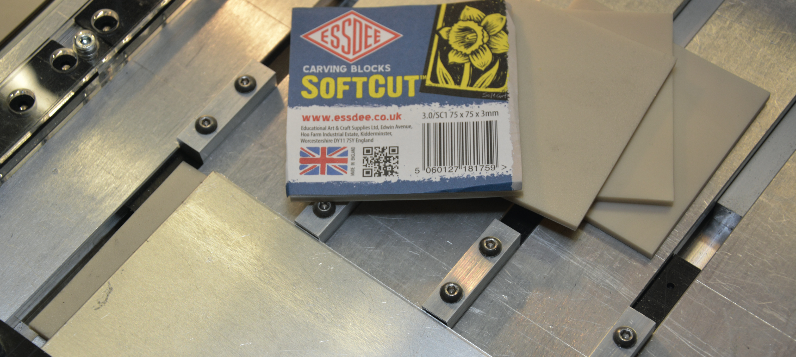 Kein S pannmittel, aber immer wieder gebraucht: Passend zugeschnittene Unterlagen, die verhindern, dass das Werkzeug beim Durchfräsen in den Maschinentisch dringt. 3 oder 4 mm starkes MDF ist gut geeignet, sehr praktisch sind aber auch diese flexiblen „Carving Pads“ aus dem Künstlerbedarf (Päckchen ab 3 Euro). Sie dämpfen Resonanzen im flachen Werkstück besser.