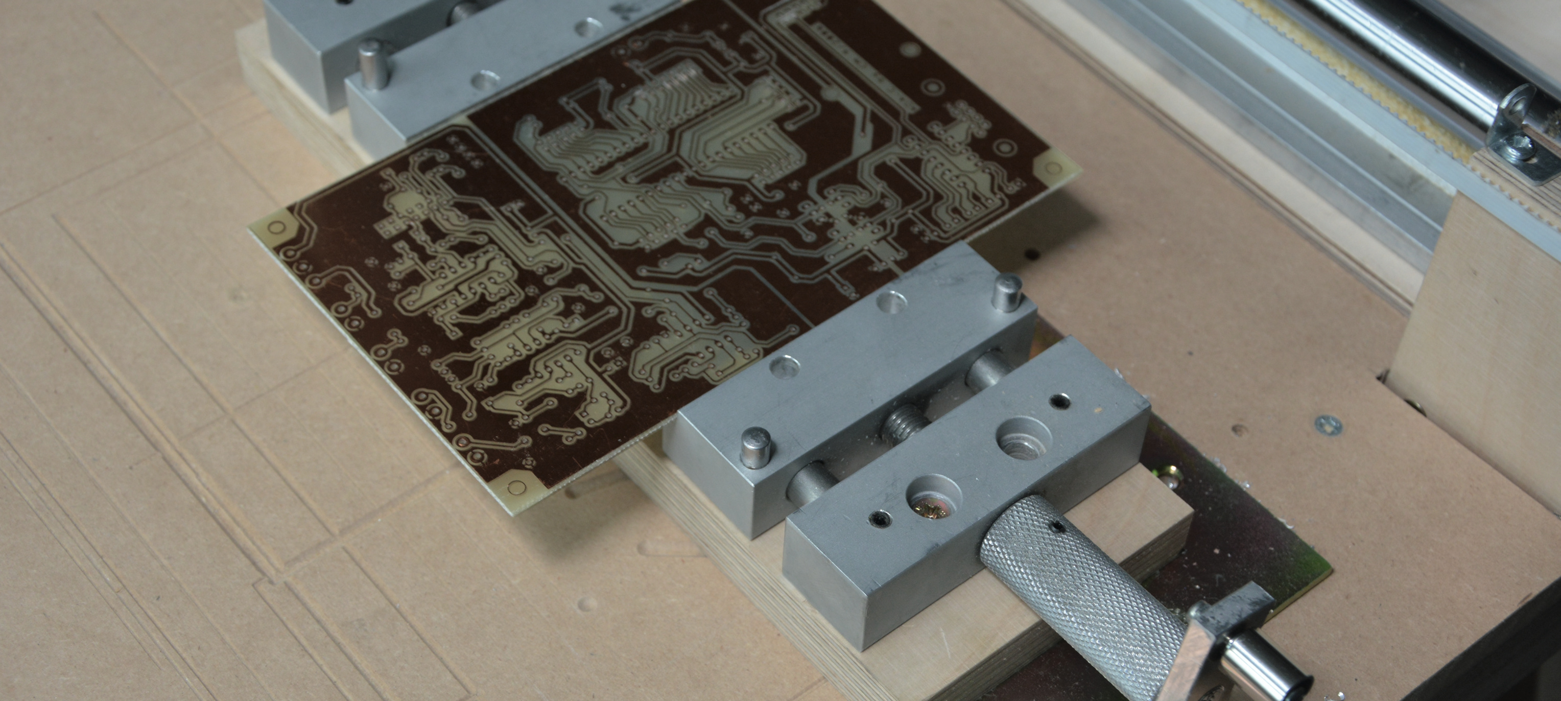 Für i mmer wiederkehrende Formate (zum Beispiel Platinen oder Frontplatten) fertigt man sich praktischerweise spezielle Halterungen aus MDF an – die dafür nötige Fräse hat man ja. Unser Platinenhalter klemmt das Material mit einer Alu-Winkelleiste und einer M4-Rändelschraube ein. Mit einem eingeschraubten Bolzen (Abstandsröllchen mit Holzschraube) hat man auch gleich einen Anschlag für einen konstanten Werkstück-Nullpunkt.
