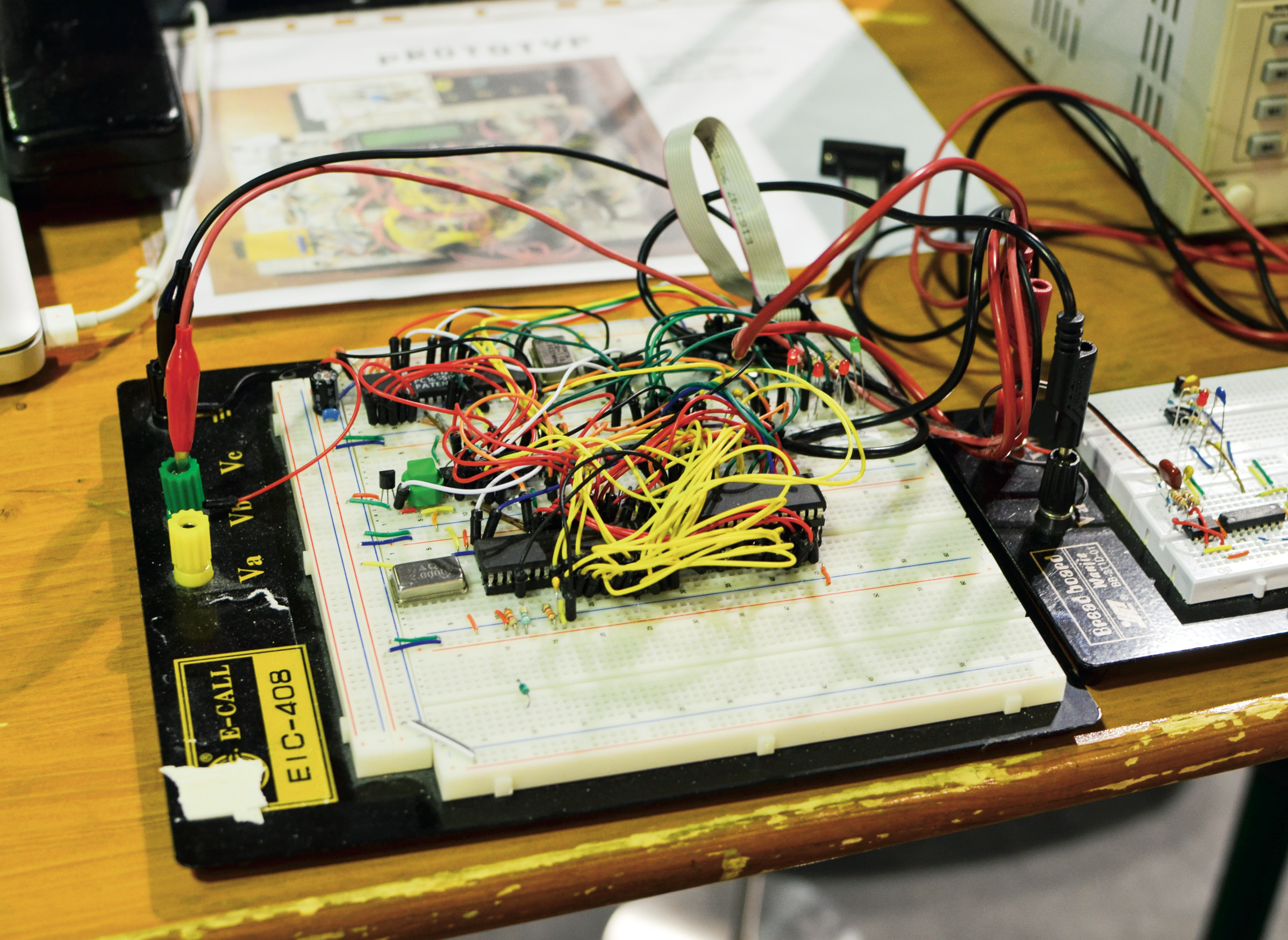 Das Projekt begann Ende 2013 ganz unscheinbar als Testschaltung auf dem Steckbrett, die zunächst nur NOP-Instruktionen ausgeführt hat. LEDs am Adressbus des Prozessors dienten als Statusanzeige. In kleinen Schritten wurden zunächst ROM, dann RAM und später eine serielle Schnittstelle hinzugefügt. Damit war es erstmalig möglich, crossassemblierten Code direkt auf das Steckschwein zu schicken und dort auszuführen. Alles noch auf dem Steckbrett, wohlgemerkt.